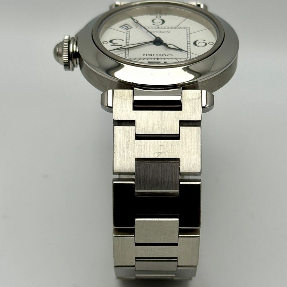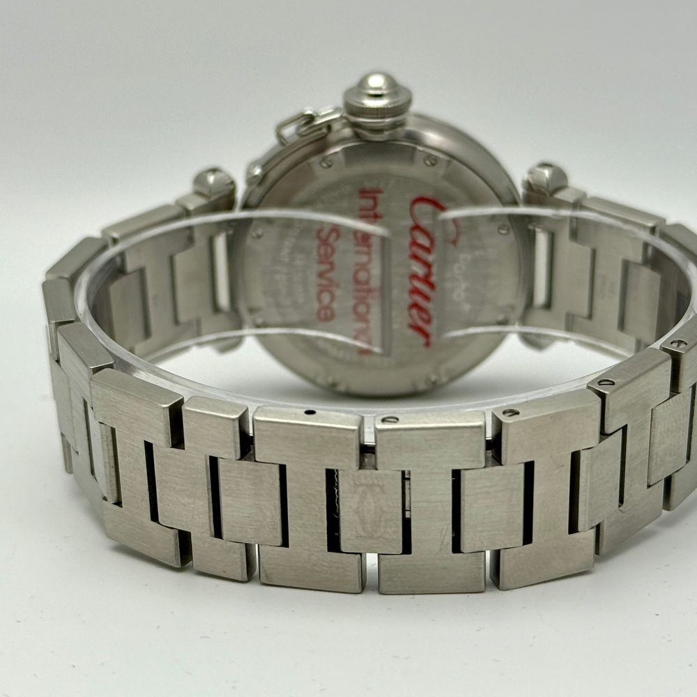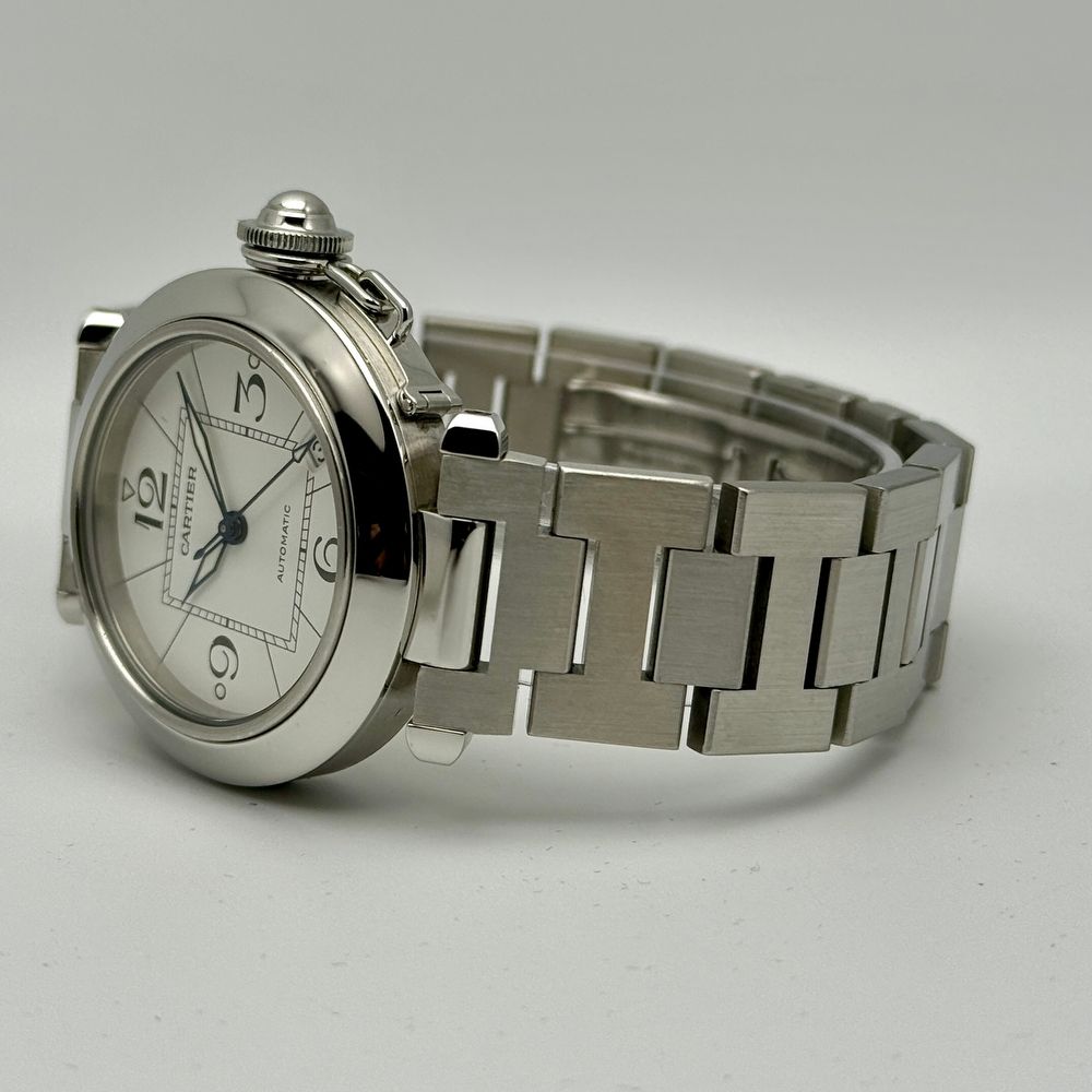 Founded in 1847 in Paris, Cartier is one of the most influential maisons in the history of luxury watchmaking, known for its iconic designs and refined elegance. The Pasha collection stands out as one of Cartier’s boldest creations, combining distinctive aesthetics with everyday versatility and strong character.The Cartier Pasha, reference W31074M7, features a 35 mm stainless steel case with the collection’s signature round shape and prominent screw-down crown cap attached by a small chain. The silvered dial is adorned with bold Arabic numerals, a central guilloché motif, and blued steel hands, creating a design that is both sporty and unmistakably Cartier. Powered by an automatic Swiss movement, it offers reliable timekeeping with functions including hours, minutes, central seconds, and a date display at 4 o’clock. A scratch-resistant sapphire crystal protects the dial, while the screw-down crown contributes to the watch’s robust construction. With 100 meters of water resistance.