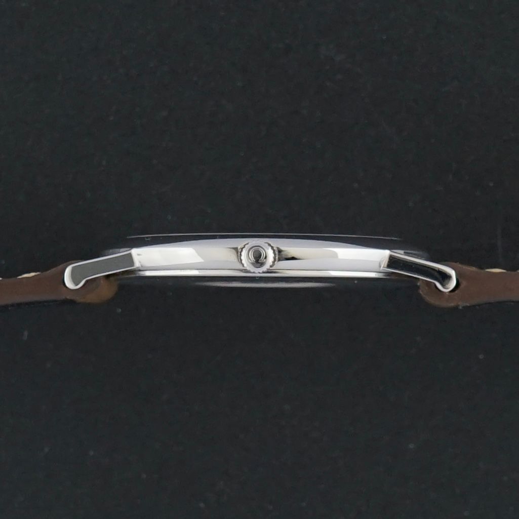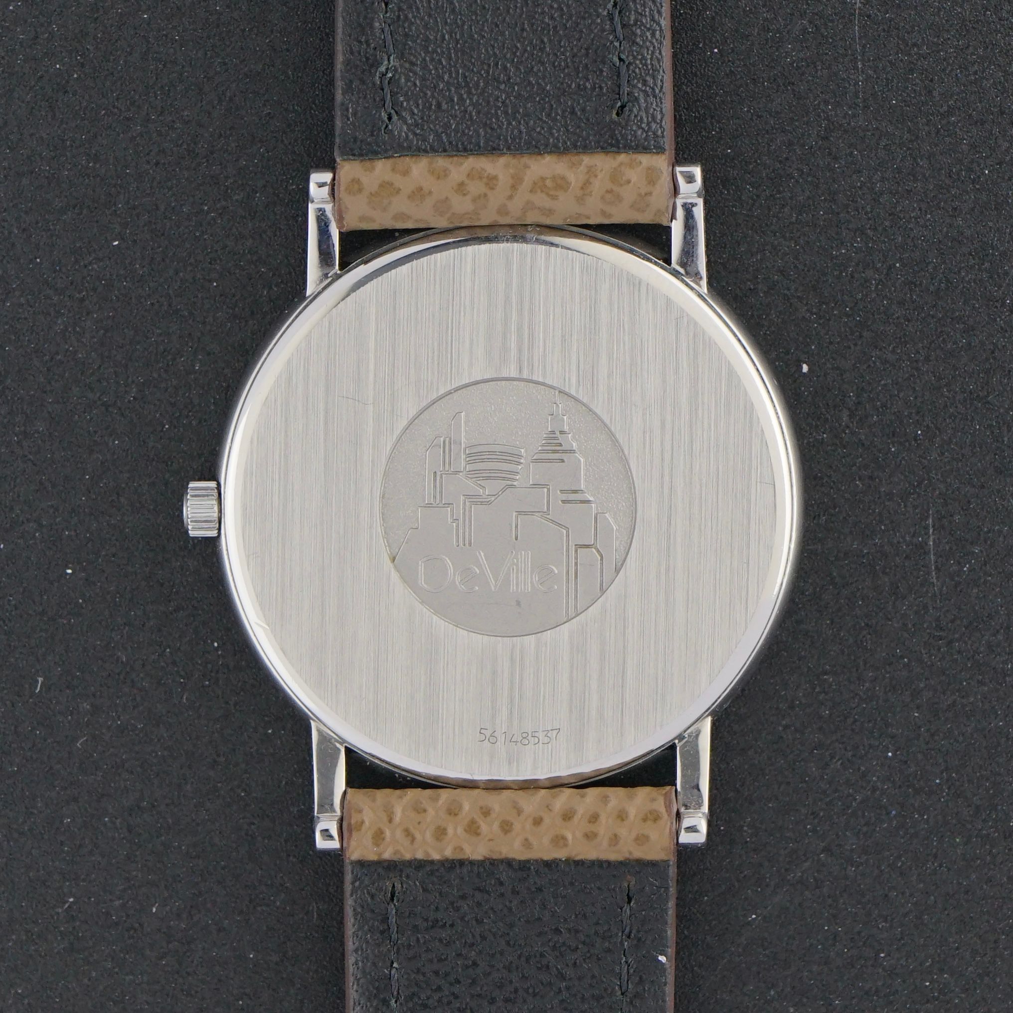 This vintage Omega De Ville was produced in 1998 and features a clean white dial in perfect condition with Roman numerals. It is fitted with elegant dark blue leaf hands and housed in a steel case that retains its original polish and is in great shape. The case measures 32.5mm in width excluding the crown, and at just 4.3mm thin it can be considered ultra thin. Inside is a quartz caliber 1478 movement which was checked and overhauled in January 2026 and now runs and functions excellently. The watch is paired with a brown leather strap, and aside from this strap the watch remains entirely original. Overall, the watch is in incredible condition and can be seen either as a subtle dress watch or as a beautiful daily wear.Year of production: 1998