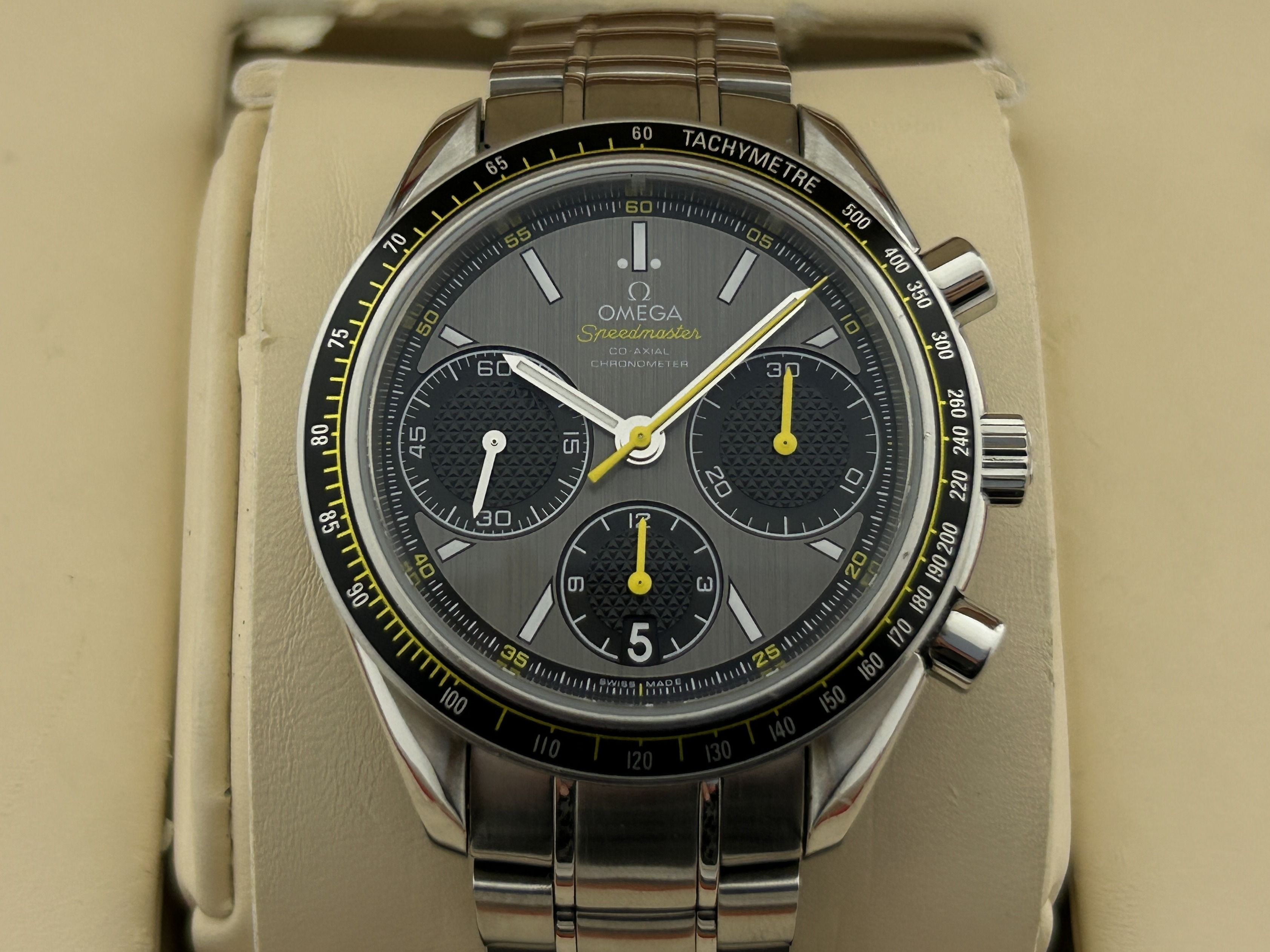 The Omega comes with 24 months of warranty.A steel Omega Speedmaster Racing, ref. 326.30.40.50.06.001, fullset, from 2017. The watch has a 40mm steel case with a steel bracelet. The Omega has a gray dial with yellow accents. The watch has a Hippocampus symbol on the back of the case. The Omega has an automatic movement with a chronograph function. The watch is from 2017, is complete with its original box and certificate. The watch comes with an extra set of black, rubber Speedmaster straps.