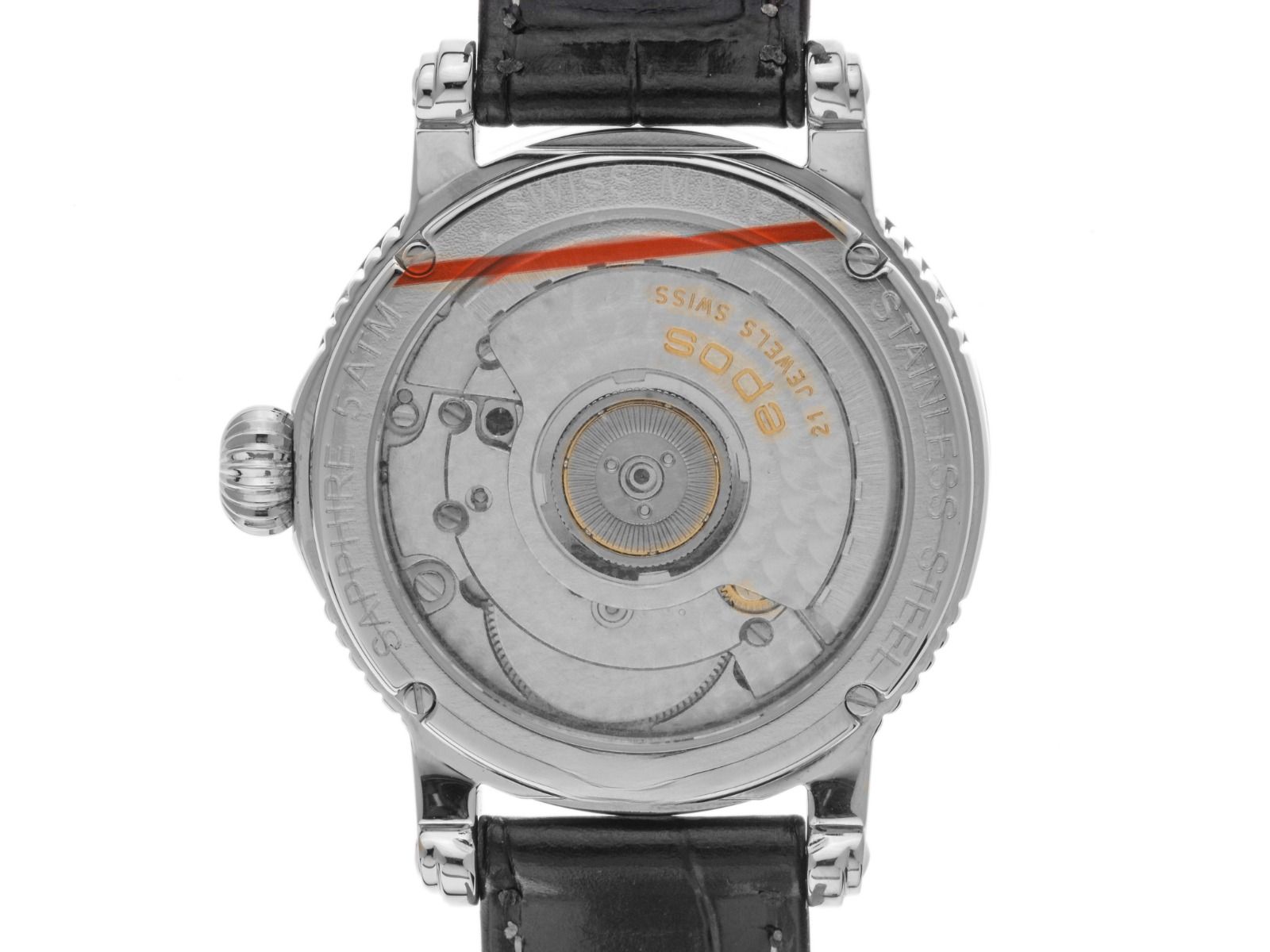 Boîtier en acier inoxydable poli, diamètre du boîtier sans couronne 34mm, hauteur du boîtier 10,0mm. Lunette en acier inoxydable poli. Bracelet en cuir de crocodile noir avec couture décorative, largeur de l'entrecorne 16mm, boucle à ardillon en acier inoxydable avec logo du fabricant. Cadran argenté partiellement guilloché avec chiffres romains bleuis et aiguilles bleuis. Mouvement automatique, calibre 2892A2 avec 21 pierres précieuses. Affichage de l'heure, des minutes et des secondes par aiguilles centrales, avec stop-seconde pour un réglage précis de l'heure, affichage de la date par aiguille avec pointe rouge au centre, affichage du jour de la semaine et du mois à 12 heures, affichage des phases de lune à 6 heures. Verre saphir résistant aux rayures. Couronne en forme d'oignon. Fond en acier inoxydable vissé et gravé avec fenêtre en verre saphir. Poids de la montre avec bracelet 52g. Numéro de référence : 11-12025-905, numéro de boîtier : 4391XXX, ID : KÜ178416000226H-3900, numéro d'article : 10000084481. Avec contrôle de marche et révision extérieure complète de février 2026. Boîte Epos originale avec carton et papiers d'avril 2011 ainsi qu'un extrait du Watchregister de février 2026, certificat The Watch Register / sans inscription (base de données internationale pour montres perdues ou volées), Full Set. Super affaire, pièce de collection très rare, de première main, presque jamais portée. Très bon état. Délai de livraison immédiat.