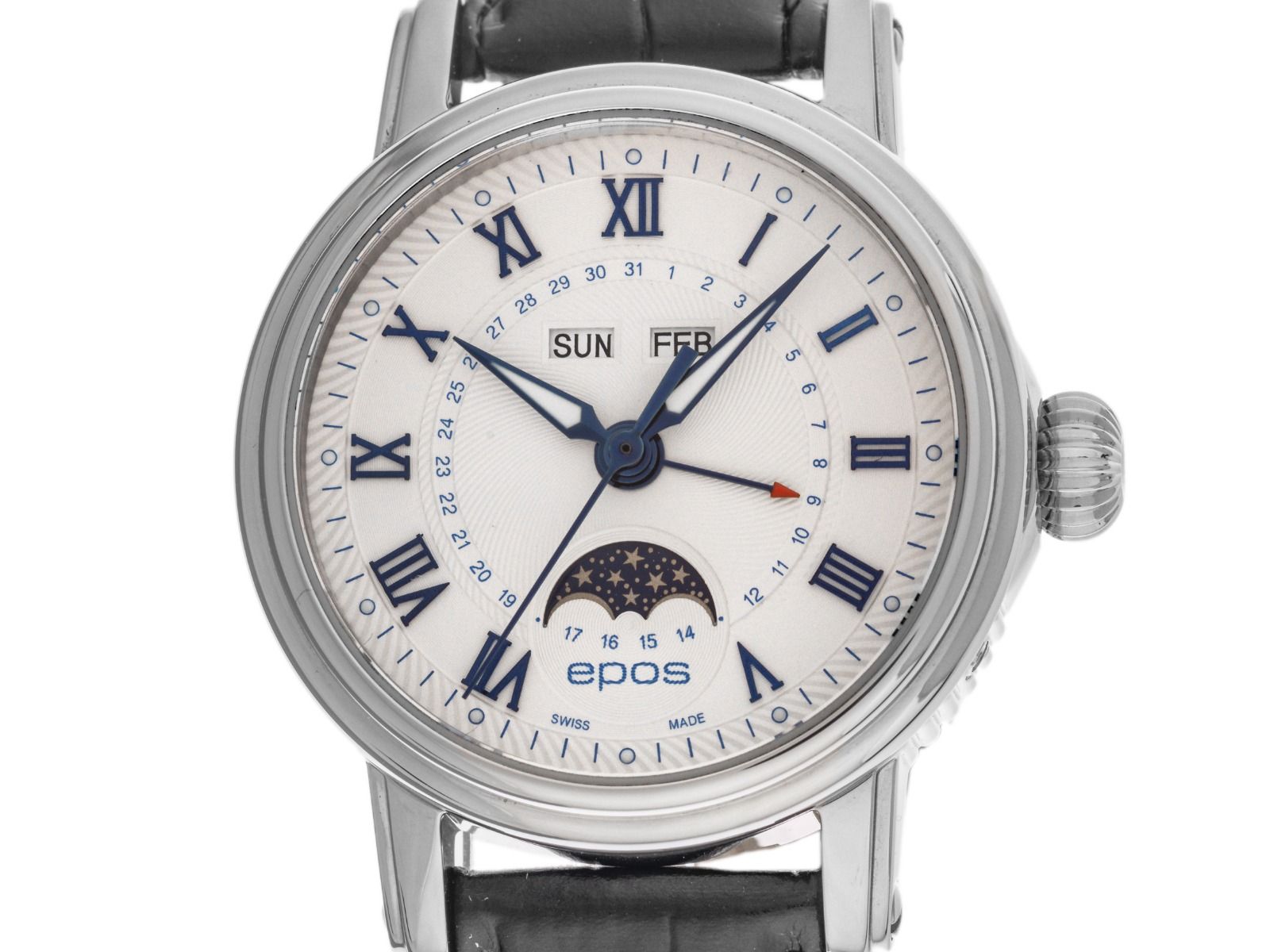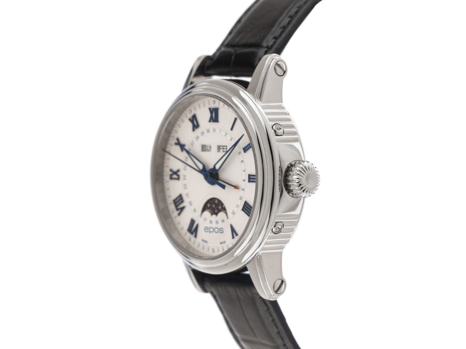 Epos Emotion Vollkalender Mondphase Automatik Armband LederGehäuse Edelstahl poliert, Gehäusedurchmesser ohne Krone 34mm, Gehäusehöhe 10,0mm. Lünette Edelstahl poliert. Armband Krokoleder schwarz mit Ziernaht, Anstoßbreite 16mm, Stiftschließe Edelstahl mit Hersteller-Logo. Zifferblatt silberfarben teilguillochiert mit gebläuten römischen Ziffern und gebläuten Zeigern. Uhrwerk Automatik, Kaliber 2892A2 mit 21 Edelsteinen. Anzeige von Stunde Minute und Sekunde über Zeiger aus der Mitte, mit Sekundenstopp zur sekundengenauen Einstellung der Uhrzeit, Datumsanzeige über Zeiger mit roter Spitze aus der Mitte, Wochentags.- und Monatsanzeige bei 12 Uhr, Mondphasenanzeige bei 6 Uhr. Saphirglas kratzfest. Zwiebelkrone. Boden Edelstahl verschraubt und graviert mit Saphirglas Sichtfenster. Gewicht der Uhr inklusive Armband 52g. Referenznummer: 11-12025-905, Gehäusenummer: 4391XXX, ID: KÜ178416000226H-3900, Artikelnummer: 10000084481. Mit Gangkontrolle und kompletter äußerlicher Aufarbeitung von Februar 2026. Original Epos Box mit Umkarton und Papiere von April 2011sowie Watchregister Auszug von Februar 2026, The Watch Register Zertifikat / ohne Eintrag (Internationale Datenbank für verlorene oder gestohlene Uhren), Full Set. Superschnäppchen, sehr seltenes Sammlerstück, aus erster Hand, fast nicht getragen. Sehr guter Zustand. Lieferzeit sofort.