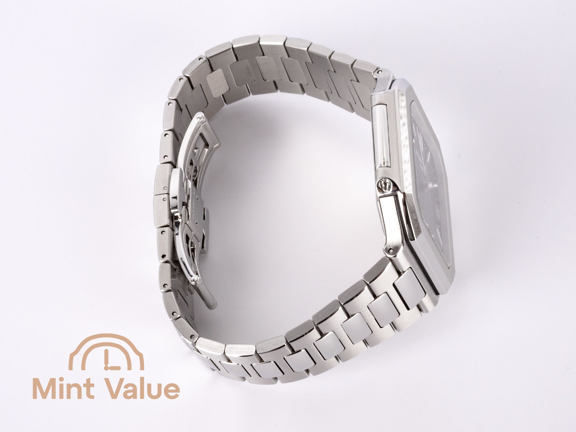 Le boîtier et le bracelet alternent surfaces polies et satinées verticales, créant un jeu dynamique de lumière et de texture sur le poignet. La forme carrée aux coins adoucis offre une présence affirmée tout en conservant des lignes raffinées.