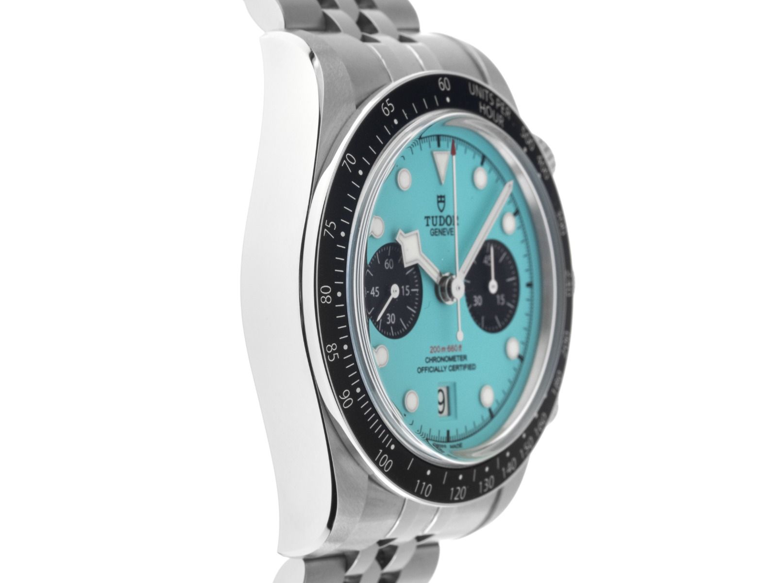 Tudor Black Bay Chronograph Stahl Automatik Chronograph Armband StahlGehäuse Edelstahl poliert und satiniert, Gehäusedurchmesser ohne Krone 41mm, Gehäusehöhe 14,4mm. Lünette Edelstahl mit schwarzem Inlay und Tachymeterskala. Armband Edelstahl poliert und satiniert, Sicherheitsfaltschließe Edelstahl mit Hersteller-Logo. Zifferblatt türkis mit aufgesetzten Leuchtindexen und Edelstahl Leuchtzeigern sowie schwarzen Hilfszifferblättern. Uhrwerk Automatik, Chronograph, Chronometer mit Zeugnis (COSC), Kaliber Tudor MT5813, Gangreserve ca. 70 Stunden. Anzeige von Stunde und Minute über Zeiger aus der Mitte, kleine Sekunde mit Sekundenstopp zur sekundengenauen Einstellung der Uhrzeit bei 9 Uhr, Datumsanzeige mit Schnellverstellung bei 6 Uhr. Saphirglas kratzfest. Krone verschraubbar mit Hersteller-Logo, Chronographen Drücker verschraubbar. Boden Edelstahl verschraubt und graviert. Gewicht der Uhr inklusive Armband 166g, Länge des Armbandes inklusive Gehäuse 180mm. Wasserdicht bis 20 ATM. Referenznummer: M79360N-0024, ID: P2469160000226H-13900/6230, Artikelnummer: 10000084707. Original Tudor Box mit Umkarton und Garantie Papiere von September 2025 sowie Beschreibung und Watchregister Auszug von Februar 2026, The Watch Register Zertifikat / ohne Eintrag (Internationale Datenbank für verlorene oder gestohlene Uhren), Full Set. Ungetragen. Lieferzeit sofort.