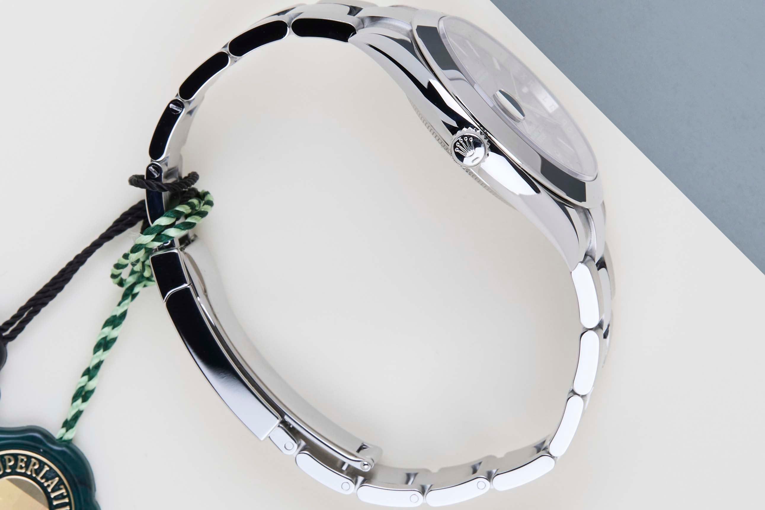 Cette Rolex Datejust 41 est en état neuf et est livrée avec la carte de garantie Rolex originale et la boîte. De plus, la montre bénéficie toujours de la garantie internationale Rolex jusqu'en octobre 2026.