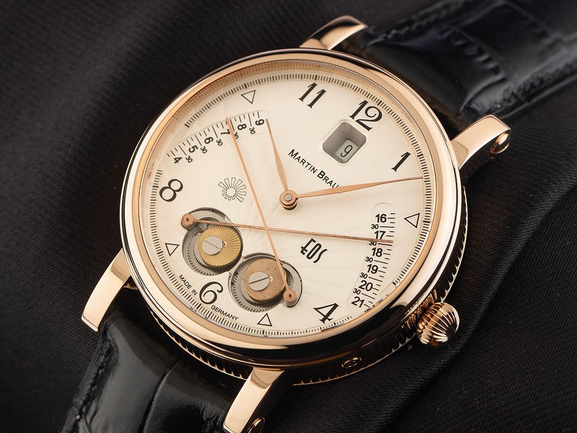 Martin Braun EOS 42/S 18kt Roségold Automatik LederGehäuse 18kt Roségold poliert und kanneliert, Gehäusedurchmesser ohne Krone 42mm, Gehäusehöhe 12,7mm. Lünette 18kt Roségold glatt und poliert. Armband Leder schwarz mit Ziernaht, Anstoßbreite 20mm, Stiftschließe Roségold vergoldet. Zifferblatt silberfarben mit graviertem Sonnenschliff, schwarzen arabischen Ziffern und roségoldenen Zeigern. Uhrwerk Automatik, Kaliber 2892A2 mit 25 Edelsteinen. Anzeige von Stunde und Minute über Zeiger aus der Mitte, Datumsanzeige mit Schnellverstellung bei 12 Uhr, Sonnenauf- und Sonnenuntergangs Anzeige über gekreuzte Zeiger bei 6 Uhr. Saphirglas kratzfest und gewölbt. Zwiebelkrone. Boden 18kt Roségold 8-fach verschraubt und graviert mit Saphirglas Sichtfenster. Gewicht der Uhr inklusive Armband 124g. Referenznummer: 42, Gehäusenummer: XXX, Baujahr: 2003, ID: KW1787160000226H-15800, Artikelnummer: 10000084648. Mit Gangkontrolle und äußerlicher Aufarbeitung von Februar 2026. Original Martin Braun Box mit Umkarton und Garantie Papiere ohne Datumseintrag, Full Set. Kapitalanlage mit Wertsteigerungspotential, extrem seltenes Sammlerstück, aus erster Hand, Tresoruhr, fast nicht getragen. Wie Neu. Lieferzeit sofort.