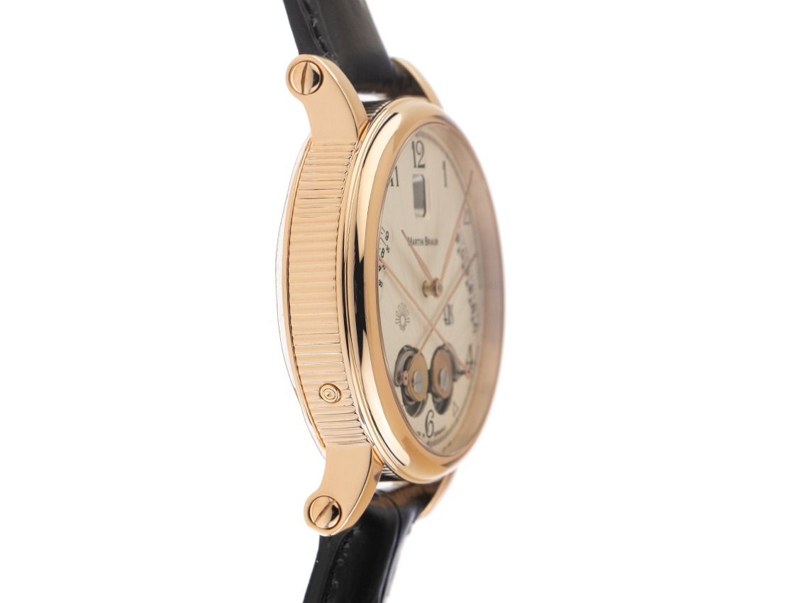 Boîtier en or rose 18kt poli et cannelé, diamètre du boîtier sans couronne 42mm, hauteur du boîtier 12,7mm. Lunette en or rose 18kt lisse et polie. Bracelet en cuir noir avec couture décorative, largeur d'attache 20mm, boucle ardillon en or rose plaqué. Cadran argenté avec finition soleil gravée, chiffres arabes noirs et aiguilles en or rose. Mouvement automatique, calibre 2892A2 avec 25 pierres précieuses. Affichage des heures et des minutes par aiguilles centrales, affichage de la date avec réglage rapide à 12 heures, indication du lever et du coucher de soleil par aiguilles croisées à 6 heures. Verre saphir résistant aux rayures et bombé. Couronne en forme d'oignon. Fond en or rose 18kt vissé 8 fois et gravé avec fenêtre en verre saphir. Poids de la montre avec bracelet 124g. Numéro de référence : 42, numéro de boîtier : XXX, année de fabrication : 2003, ID : KW1787160000226H-15800, numéro d'article : 10000084648. Avec contrôle de marche et remise en état extérieure de février 2026. Boîte originale Martin Braun avec carton d'emballage et papiers de garantie sans date d'entrée, ensemble complet. Investissement avec potentiel d'appréciation, pièce de collection extrêmement rare, de première main, montre de coffre, presque pas portée. Comme neuve. Délai de livraison immédiat.