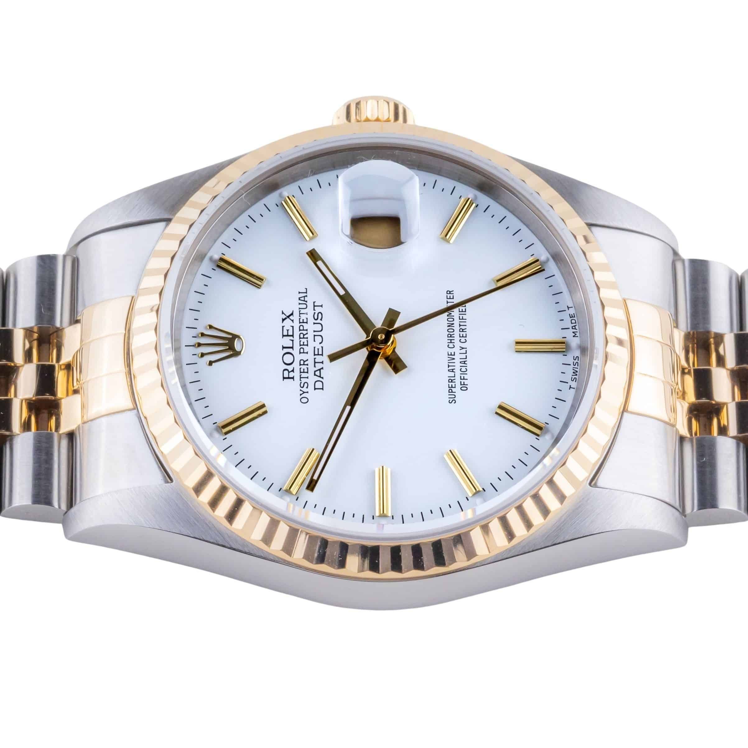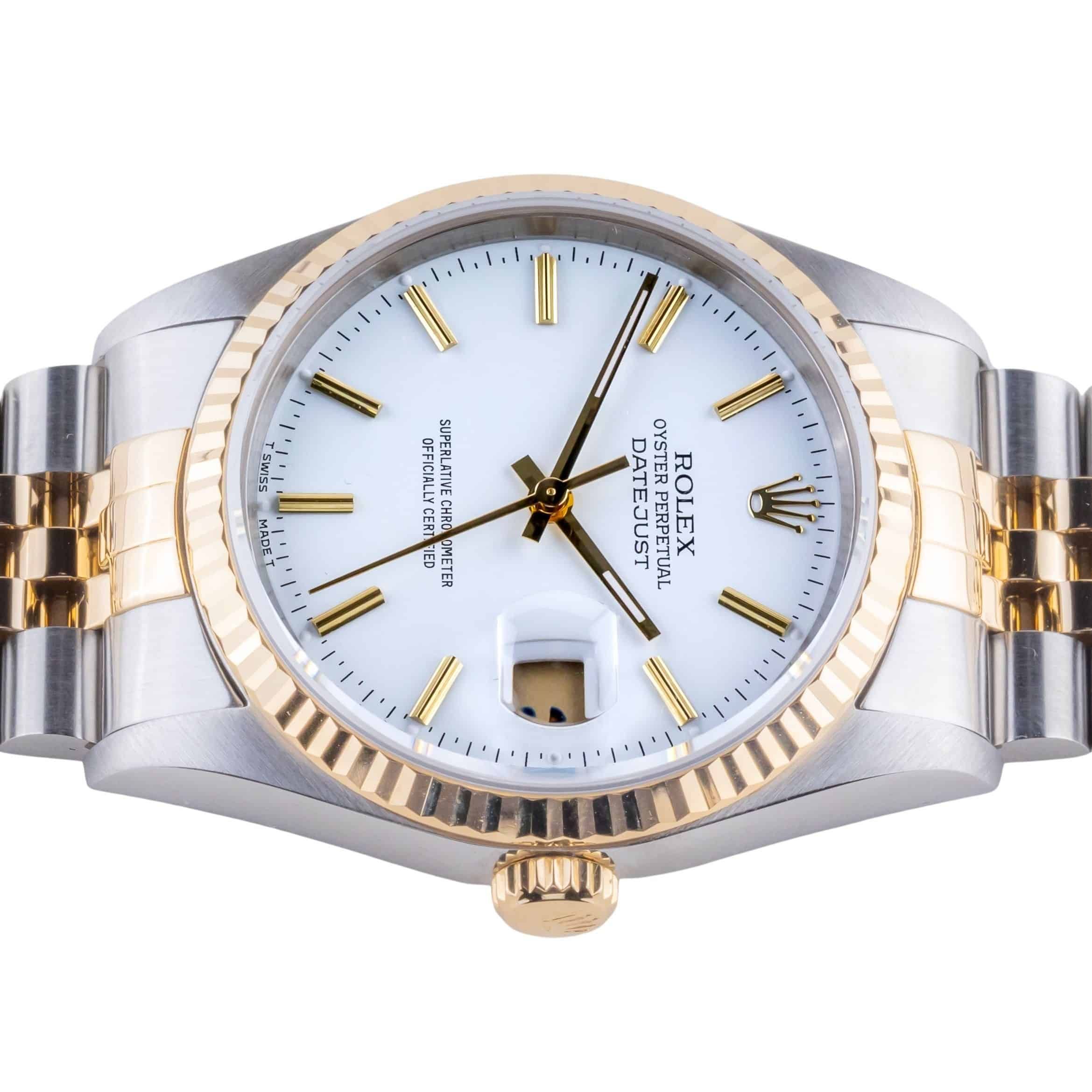Rolex Oyster Perpetual Datejust référence 16233 de 1996, comprenant l'ensemble complet. La Datejust 16233 mesure un boîtier en or et acier inoxydable de 36 mm, un bracelet Jubilee bicolore et une lunette cannelée en or 18 carats. Cette Datejust 16233 est équipée d'un mouvement automatique calibre 3135 avec fonction de date rapide, d'un verre saphir résistant aux rayures et d'un cadran blanc.
