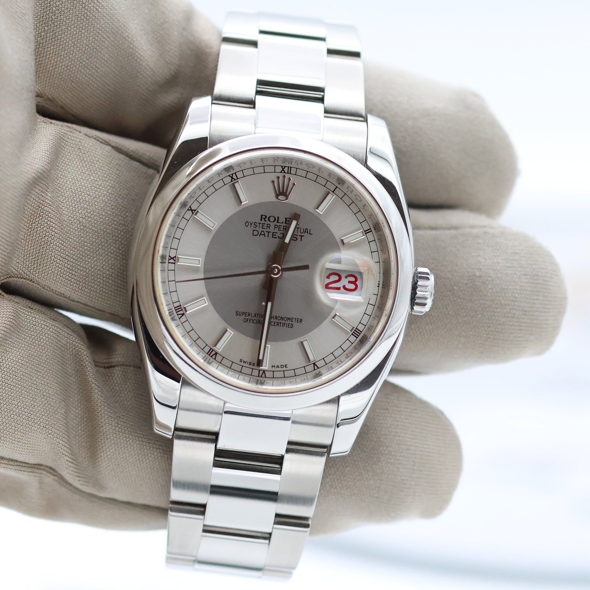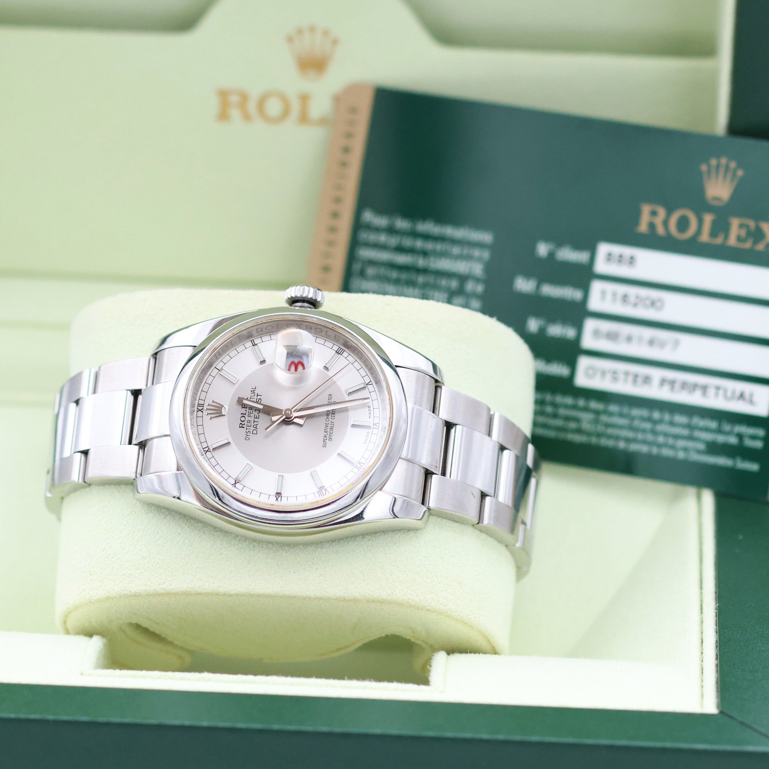 For sale at Debonar Watches: pre-owned Rolex Datejust 116200, in excellent conditions, with a modern silver/dark silver dial (called "Tuxedo") and with Warranty Rolex and box.Debonar Watches offers this exquisite pre-owned Rolex Datejust 116200—authentic, certified, and ready to be yours.This 116200 presents a silver dial and it is made entirely of steel, including bracelet and bezel.One of the biggest changes Rolex has made to their production base in recent years is their switch from 316L stainless steel to 904L. The ref. 1162XX series were the first Datejusts cast in the new metal.The reference 116200 is a 36mm watch. For many, 36mm is a relatively small watch (at least by modern standards), but the Datejust has always had an uncanny knack for shrugging off perceptions that apply to virtually all its competitors. A bit of its story:Rolex DateJust (inspired by Rolex Bubbleback) was first introduced in 1945 to celebrate the 40th anniversary of Rolex. The Datejust is one of the earliest Rolex models that survives till today.From its debut way back in 1945, a revolutionary launch that put the brand firmly on the map, it has remained at the top of the company’s bestseller list for three quarters of a century.Rolex’s ref. 162XX series of Datejust watches first emerged in 1988, a replacement for the relatively short-lived ref. 160XX range. The Rolex Datejust reference 116200 was announced at Baselworld 2004. BRAND ROLEX MODEL DATEJUST REFERENCE 116200 CASE MATERIAL STEEL MOVEMENT AUTOMATIC DIMENSION 36 MM DIAL SILVER/DARK SILVER BEZEL STEEL CRYSTAL SAPPHIRE BRACELET TYPE OYSTER BRACELET MATERIAL STEEL WRIST DIAMETER 18 CM ORIGINAL BOX YES ORIGINAL PAPERS YES YEAR APPROX. '00s-'10s CONDITION EXCELLENT