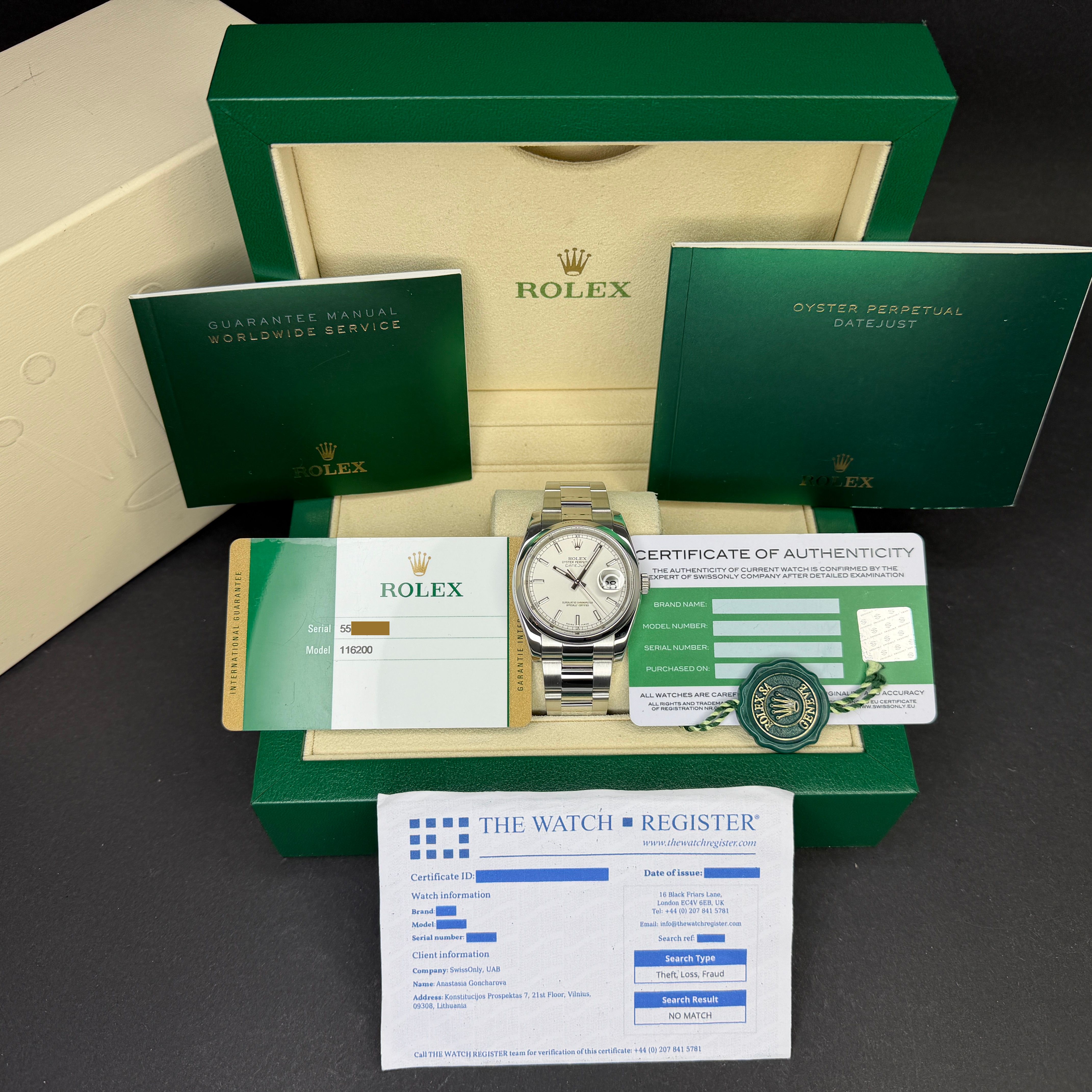 This Rolex Datejust 116200 features a Silver dial and is crafted from stainless steel, with a production year of 2015.Case No: 5519XXXX