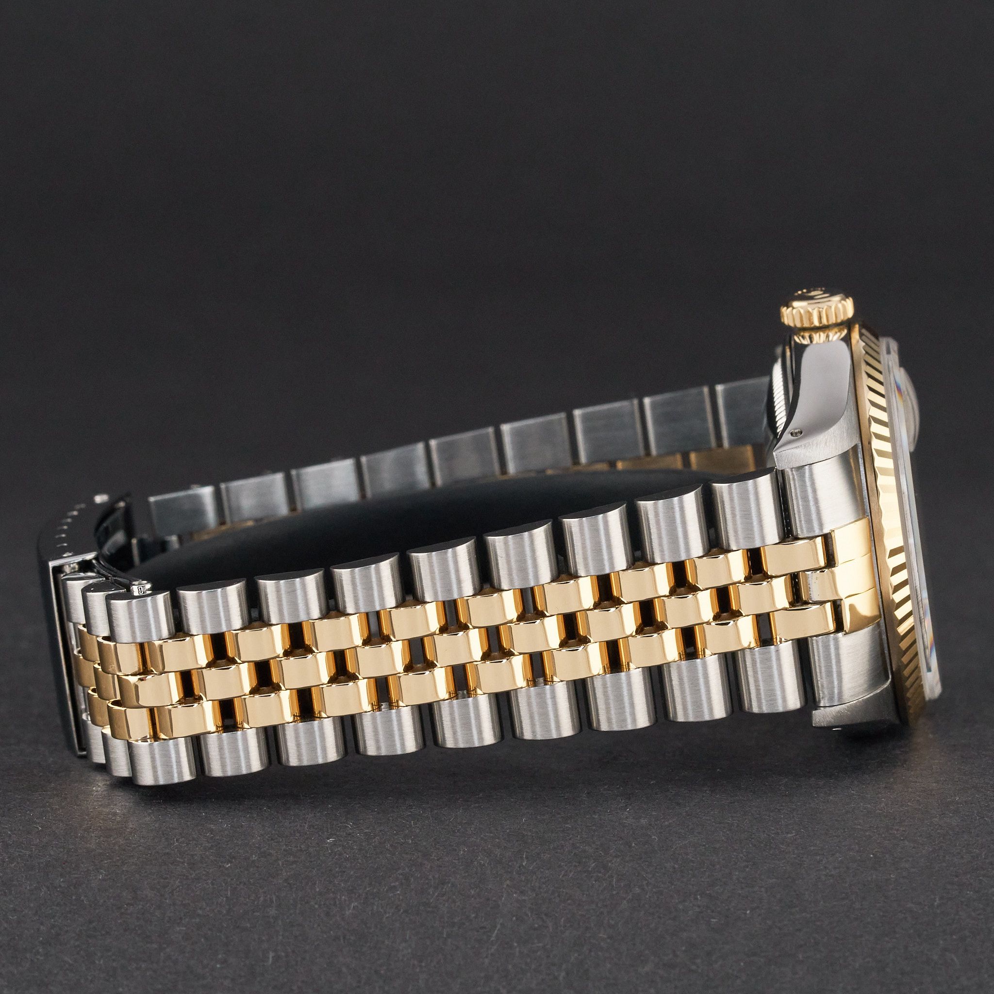 This Rolex Datejust 16233 features a Champagne small diamond dial and is crafted from 18K yellow gold and stainless steel, with a production year of 1990.Case No: E41XXXX