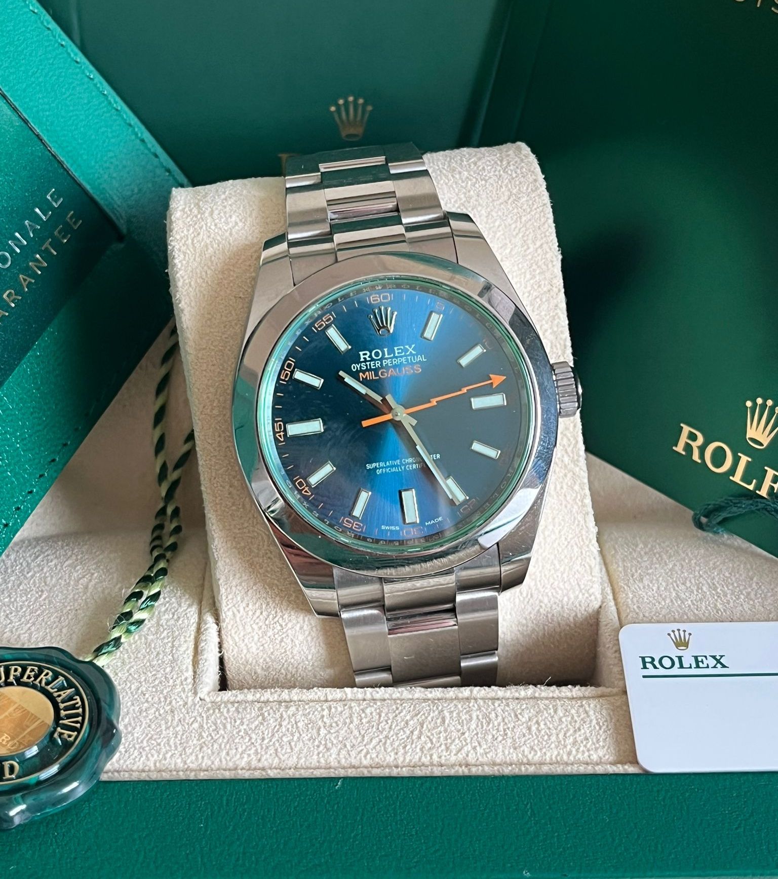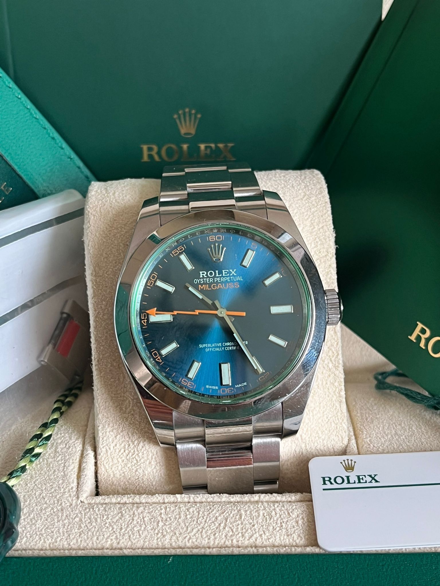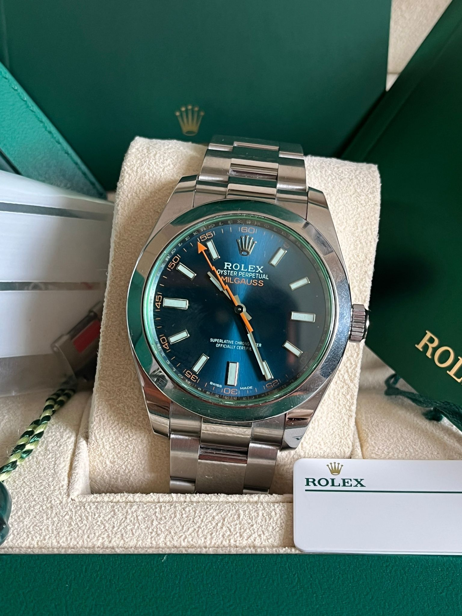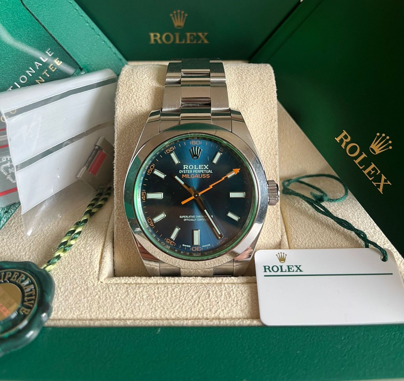 This stunning Rolex Milgauss ref. 116400GV is presented with the iconic green sapphire crystal (Glace Verte) and the distinctive blue dial featuring orange accents and the signature lightning bolt seconds hand—one of the most recognizable and characterful configurations within the Rolex Professional collection. The combination of the 40 mm Oyster case in stainless steel, the smooth polished bezel, and the vibrant details of the Milgauss dial results in a perfectly balanced timepiece that blends technical innovation with bold design.Originally sold in August 2021, this example is in good condition and remains a highly attractive piece for both collectors and daily wearers. The warranty card is dated 2023; this date was added later, which is not uncommon when a specific date is requested. The original sales date, however, is August 2021.