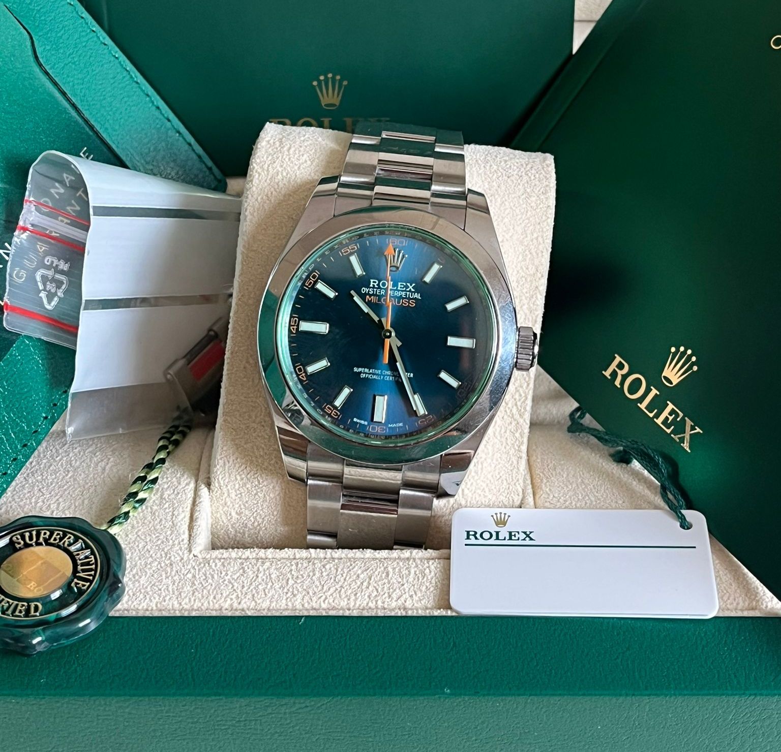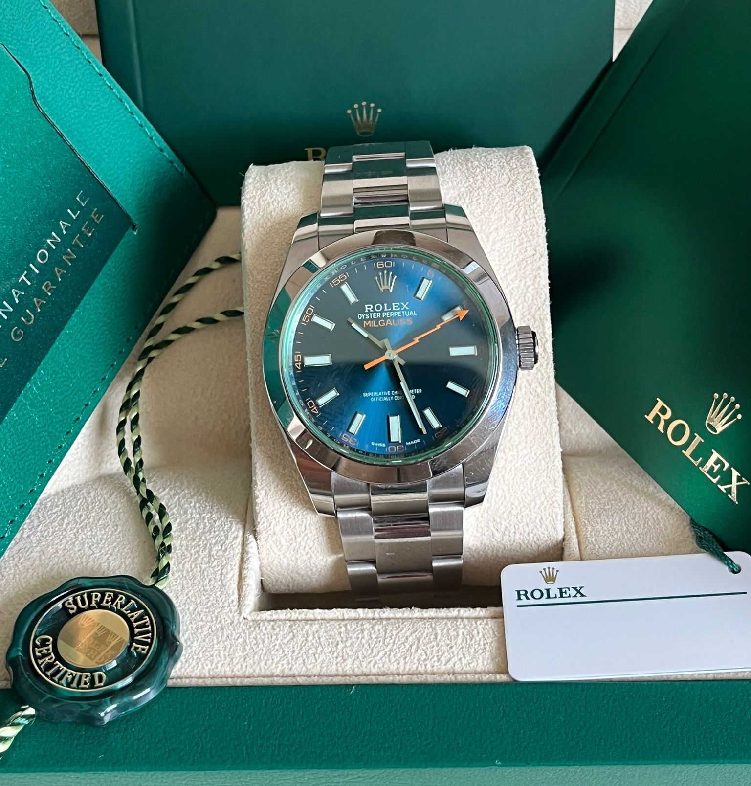 The watch is powered by the Rolex in-house caliber 3131, renowned for its exceptional resistance to magnetic fields, precision, and reliability, and is of course running within factory specifications. The Milgauss was specifically engineered for scientists and engineers working in high magnetic environments, making it one of the most technically unique models in the Rolex lineup.