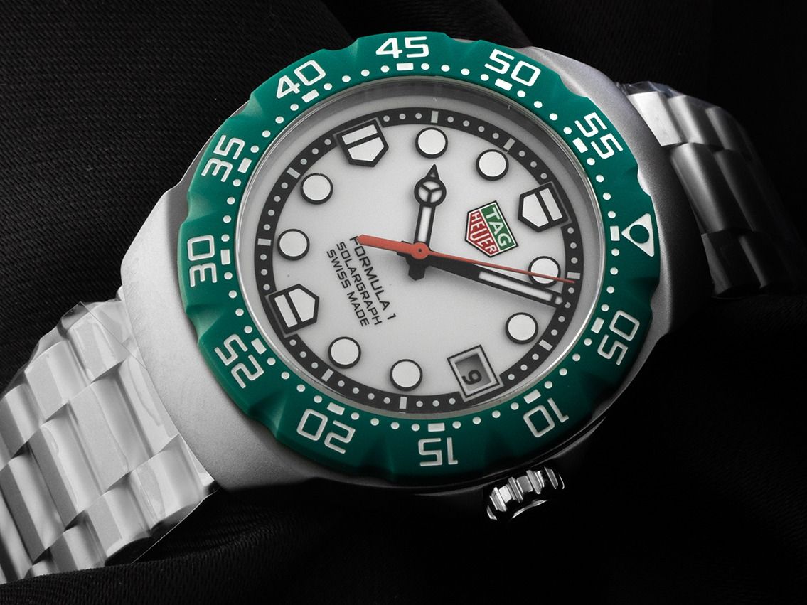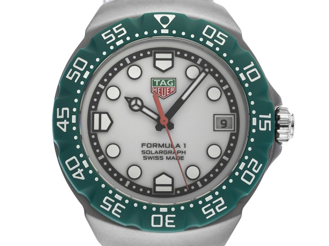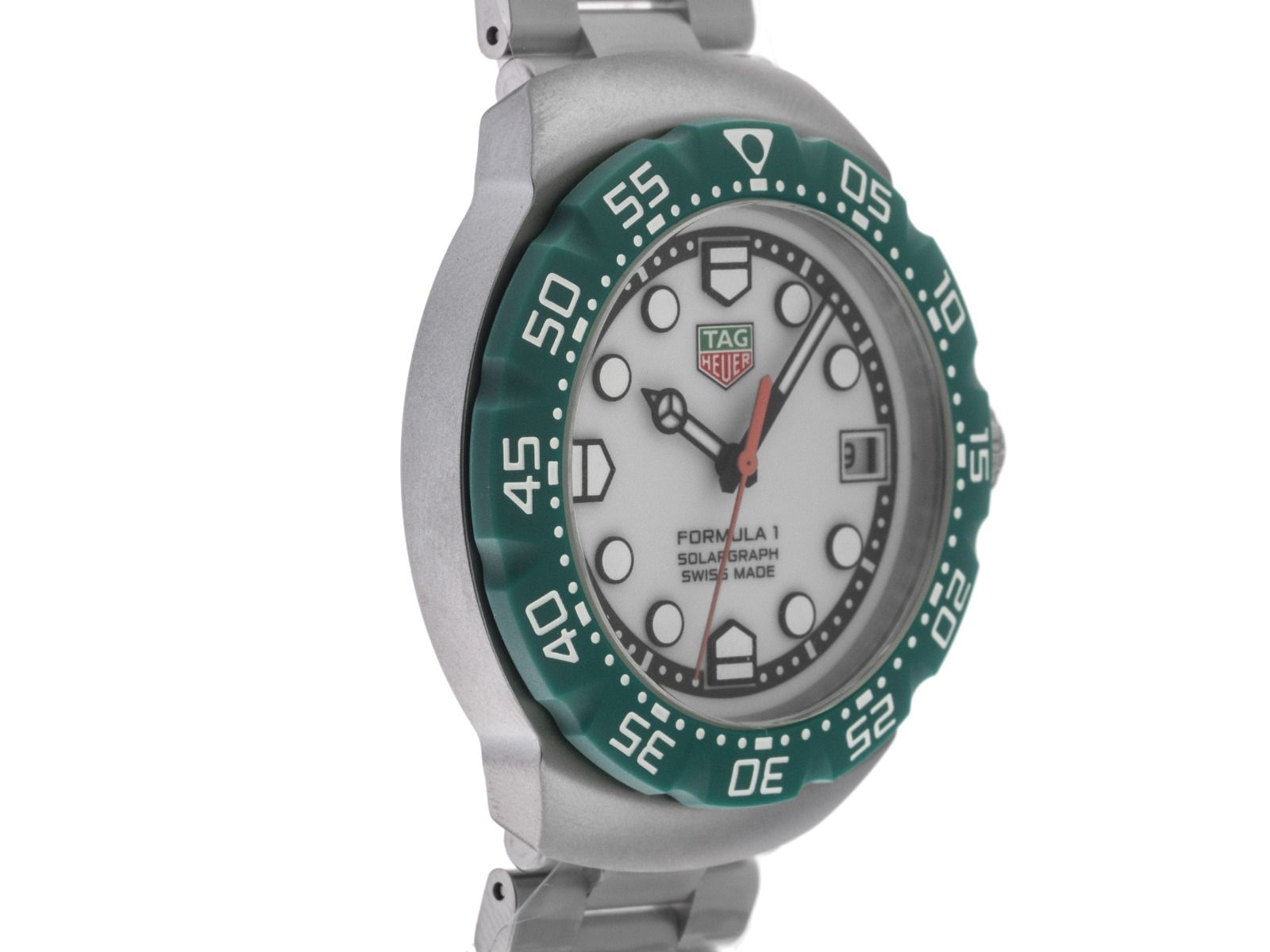Tag Heuer Formula 1 Solargraph Stahl Quarz Armband StahlGehäuse Edelstahl satiniert, Gehäusedurchmesser ohne Krone 38mm, Gehäusehöhe 10,2mm. Lünette TH-Polylight grün mit 60-Minuten Einteilung, beidseitig drehbar. Armband Edelstahl satiniert, Sicherheitsfaltschließe Edelstahl mit Hersteller-Logo. Zifferblatt weiß mit aufgesetzten Leuchtindexen und schwarzen Leuchtzeigern. Uhrwerk quarzgesteuert Kaliber TH50-00. Anzeige von Stunde, Minute und Sekunde über Zeiger aus der Mitte mit Sekundenstopp zur sekundengenauen Einstellung der Uhrzeit, Datumsanzeige mit Schnellverstellung bei 3 Uhr. Saphirglas kratzfest. Krone geriffelt mit Flankenschutz und Hersteller-Logo. Boden Edelstahl verschraubt und graviert mit Tag Heuer Relief. Gewicht der Uhr inklusive Armband 115g, Länge des Armbandes inkl. Gehäuse 200mm. Wasserdicht bis 10 ATM. Referenznummer: WBY111E.BA0042, ID: ST116026960126H-2050, Artikelnummer: 10000084476. Original Tag Heuer Box mit Umkarton und Garantie Papiere von 2026, Full Set. Ungetragen. Lieferzeit sofort.