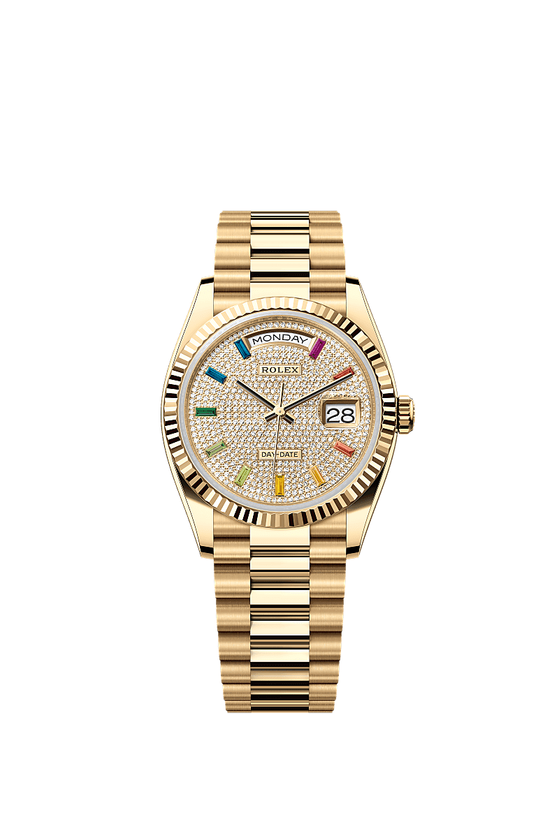 Rolex 128238-0051 Day-Date 36 Or Jaune / Canellé / Pavé Arc-en-Ciel / Président