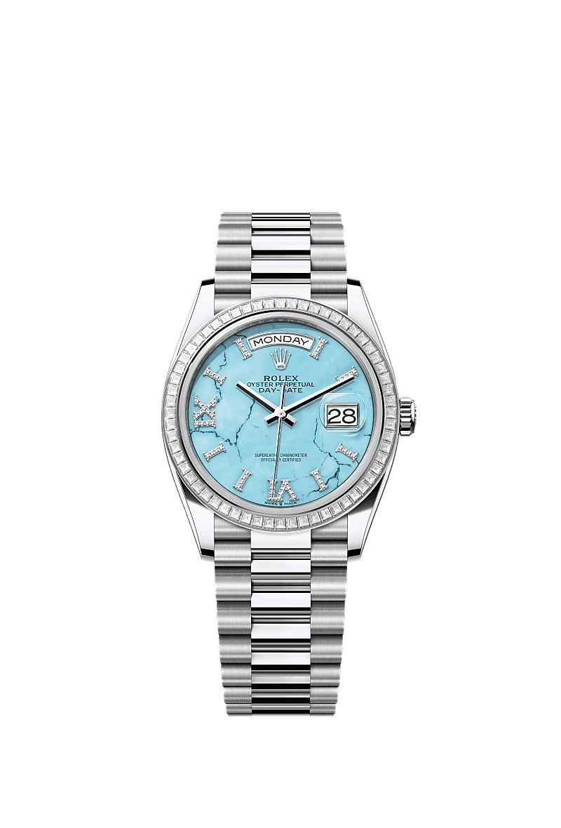 Rolex 128396TBR-0016 Day-Date 36 Platinum - Baguette / Turquoise / President