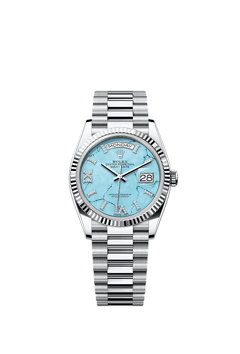 Rolex 128236-0011 Day-Date 36 Platine - Cannelé / Turquoise / Président