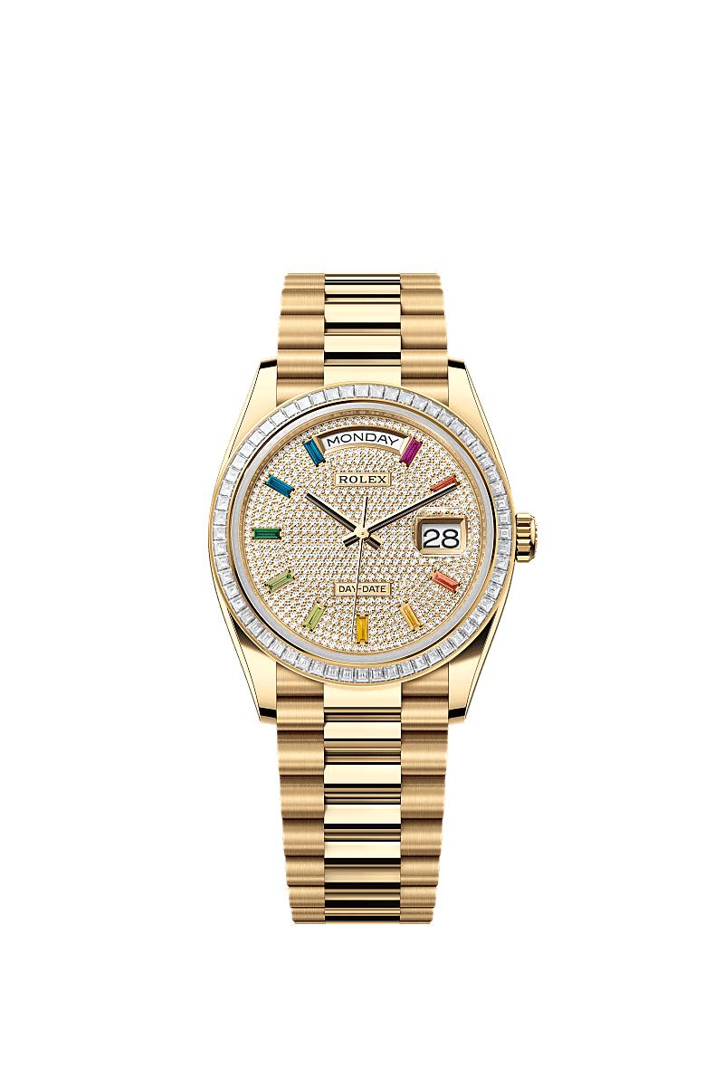 Rolex 128398TBR-0012 - Day-Date 36 Yellow Gold - Baguette / Paved - Rainbow / President