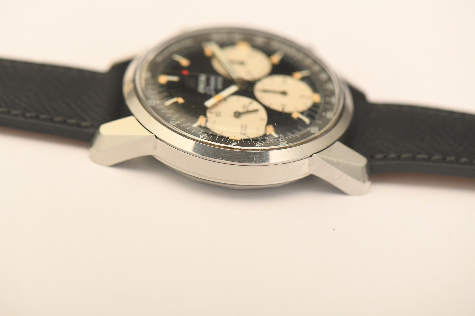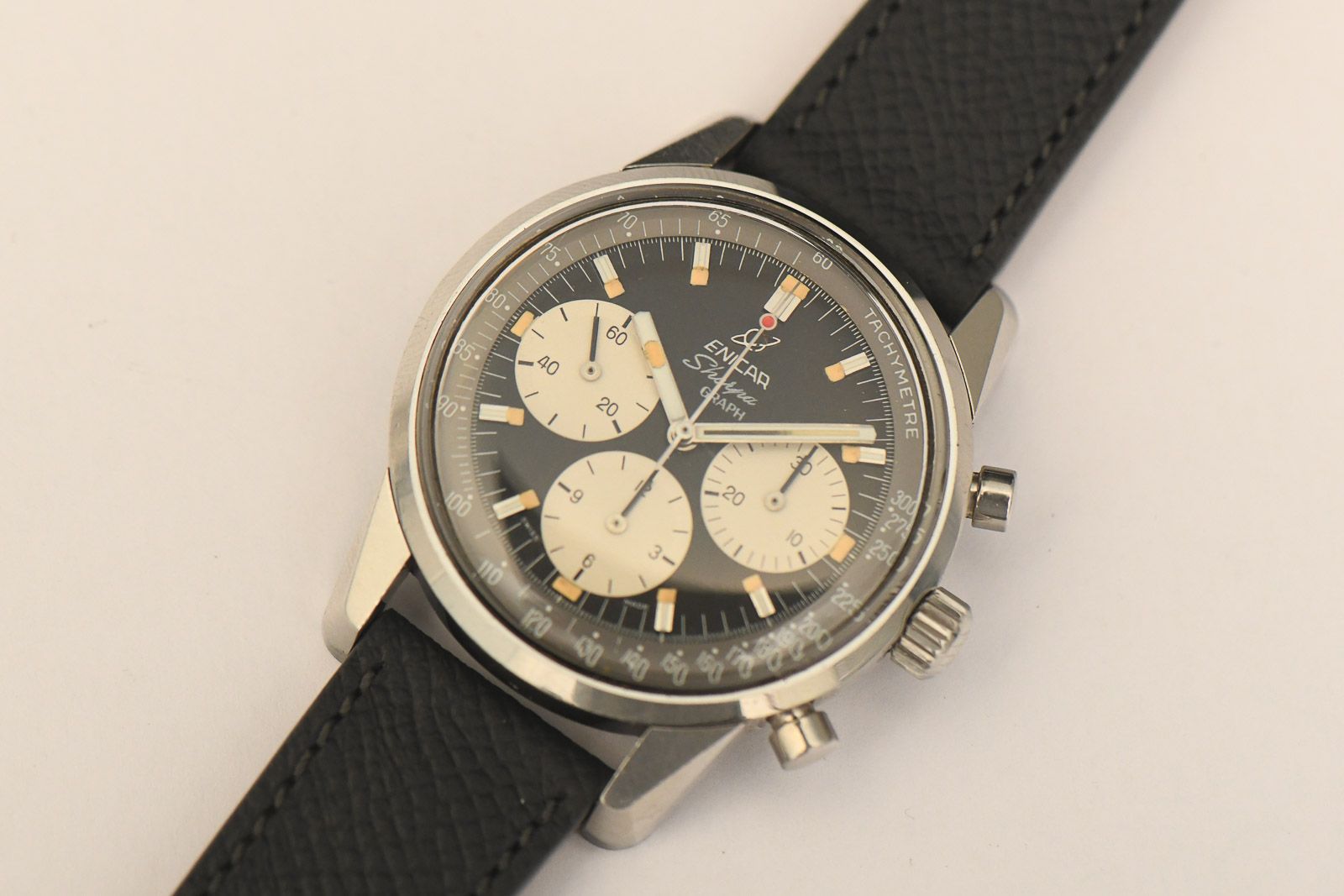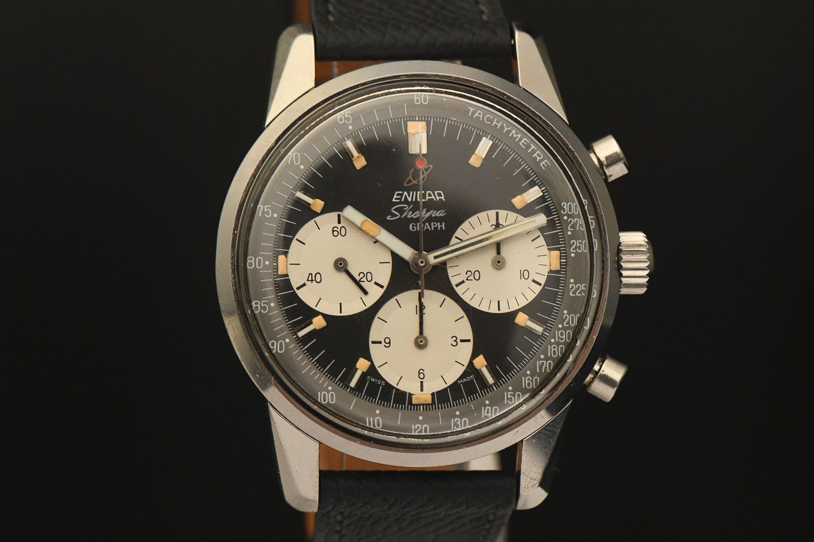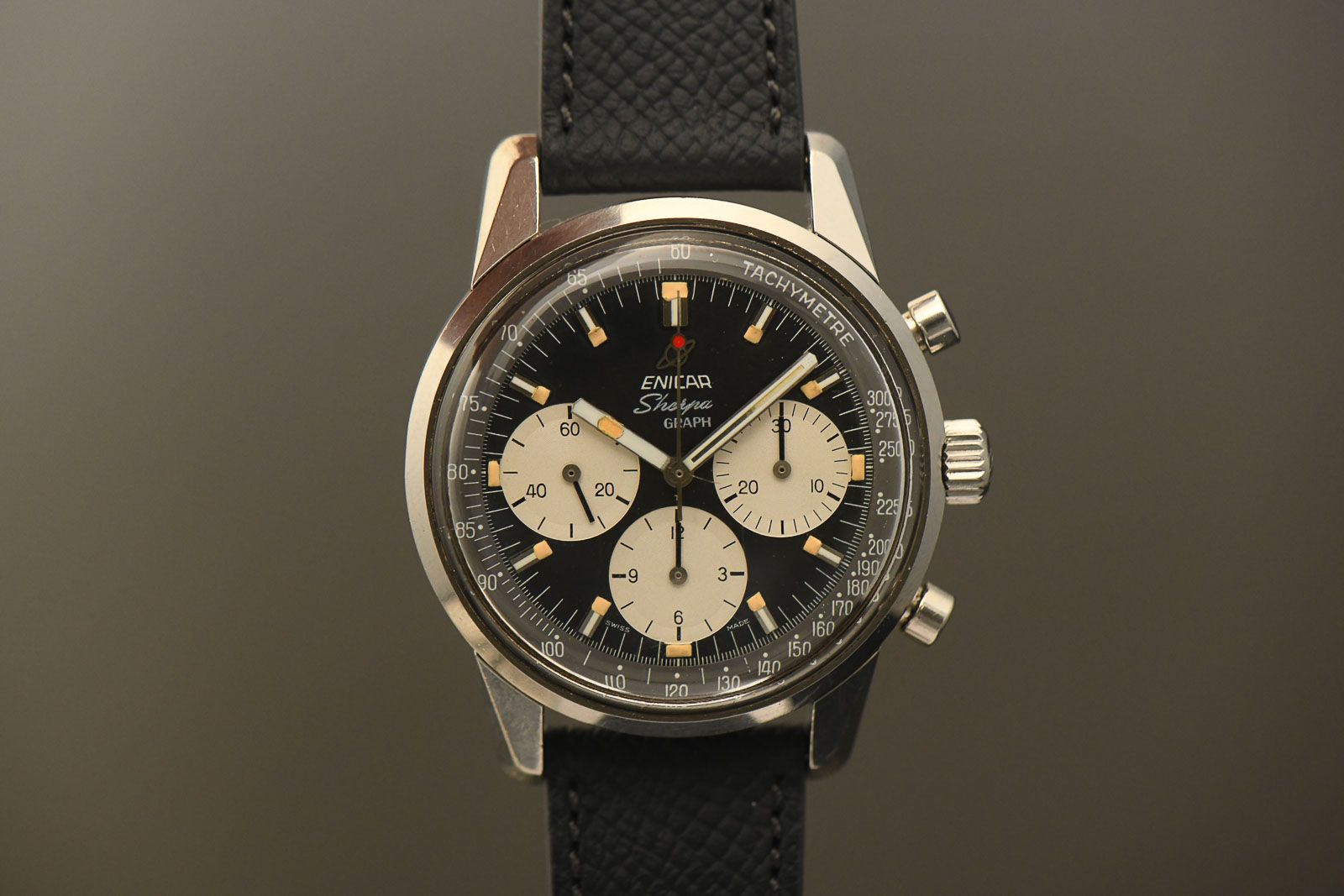 ENICAR Sherpa Graph 1967 Valjoux 72 Chronograph 40mm. Very beautiful Enicar Sherpa Graph Mk 3.5. For me, this wonderful chronograph with its 40mm stainless steel Compressor case is one of the best iterations of late 60s chronographs. The Mk 3.5 version is not very widely distributed; however, I have seen several watches with this exact configuration, all with serial numbers in very close proximity to one another. It starts with the central seconds hand (paddle hand) and the dial of the Mk 3, features the hour/minute hands of the Mk 4, and concludes with a serial number identified as an early Mk 4. This makes absolute sense and should soon find its way into the relevant literature. The present specimen is in very beautiful, near-mint optical condition. The movement was completely overhauled in 02/26 and runs perfectly. All numbers are clearly legible and are chronologically consistent.