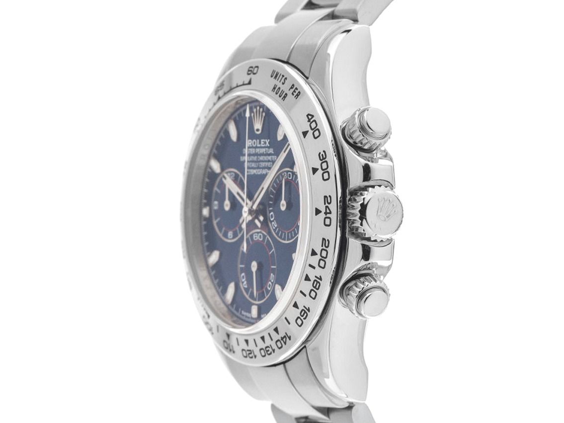 Rolex Daytona 18kt Weißgold Automatik Armband OysterGehäuse 18kt Weißgold poliert und satiniert, Gehäusedurchmesser ohne Krone 40mm, Gehäusehöhe 12,5mm. Lünette 18kt Weißgold poliert mit gravierter Tachymeterskala. Armband Oyster 18kt Weißgold poliert und satiniert, Sicherheitsfaltschließe 18kt Weißgold mit Hersteller-Logo. Zifferblatt blau mit aufgesetzten in Weißgold gefassten Indexen und weißgoldenen Zeigern. Uhrwerk Automatik, Chronograph, Chronometer mit Zeugnis, Rolex Manufakturkaliber 4130 mit 44 Edelsteinen. Anzeige von Stunde und Minute über Zeiger aus der Mitte, kleine Sekunde mit Sekundenstopp zur sekundengenauen Einstellung der Uhrzeit bei 6 Uhr. Saphirglas kratzfest. Krone verschraubbar mit Flankenschutz und Hersteller-Logo, Chronographen Drücker verschraubbar. Boden 18kt Weißgold verschraubt. Gewicht der Uhr inklusive Armband 205g, Länge des Armbandes inklusive Gehäuse 185mm. Referenznummer: 116509, Gehäusenummer: Z854XXX, ID: KA1395722100225H-44500, Artikelnummer: 10000078566. Mit Gangkontrolle und kompletter äußerlicher Aufarbeitung von Februar 2025, inkl. 1000 Tage Garantie. Original Rolex Box mit Umkarton und Garnatie Papiere von September 2009 sowie Beschreibung, Ledermäppchen, Rolex Chronometer-Siegel und Watchregister Auszug von Februar 2025, The Watch Register Zertifikat / ohne Eintrag (Internationale Datenbank für verlorene oder gestohlene Uhren), inkl. Rolex Service Card von Juli 2018, LC 150 / Spain EU, Full Set. Kapitalanlage mit Wertsteigerungspotential, fast nicht getragen. Wie Neu. Lieferzeit sofort.