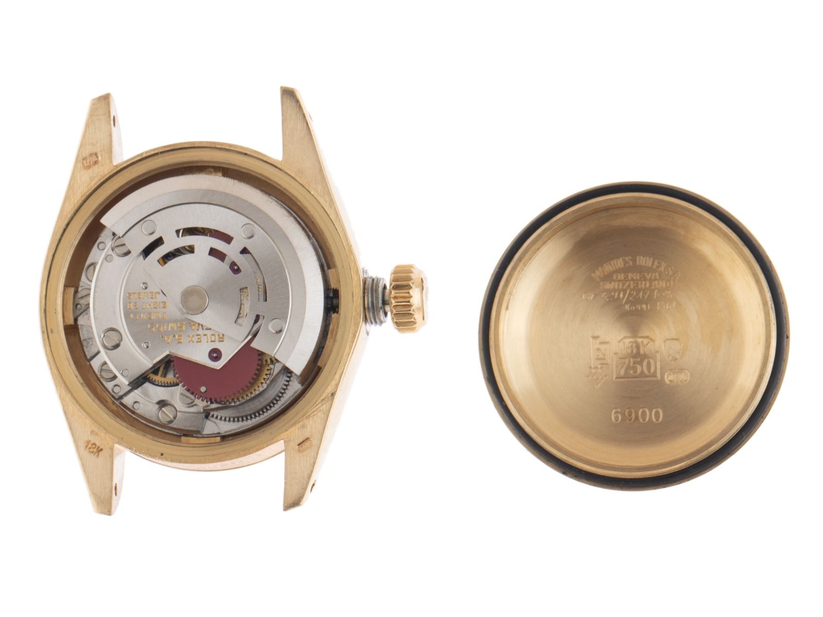 Boîtier en or jaune 18kt poli et satiné, diamètre du boîtier sans couronne 26mm, hauteur du boîtier 10,1mm. Lunette en or jaune 18kt cannelée et polie. Bracelet Président en or jaune 18kt poli et satiné, fermoir déployant Rolex en or jaune 18kt avec logo du fabricant. Cadran couleur champagne avec chiffres romains noirs et aiguilles en or jaune. Mouvement automatique, chronomètre, calibre manufacture Rolex 2030 avec 28 pierres précieuses. Affichage de l'heure, des minutes et des secondes par aiguilles centrales avec arrêt des secondes pour un réglage précis de l'heure, affichage de la date sous verre loupe à 3 heures avec open 6/9 (6 et 9 ouvertes dans l'affichage de la date). Plexiglas. Couronne vissée avec logo du fabricant. Fond en or jaune 18kt vissé. Poids de la montre y compris le bracelet 67g, longueur du bracelet y compris le boîtier 150mm. Numéro de référence : 6917, numéro de boîtier : 6487XXX, année de fabrication : 1980, ID : P1711159801025H-12500, numéro d'article : 10000082630. Avec contrôle de marche et révision complète extérieure d'octobre 2025. Boîte Rolex d'origine avec carton d'emballage et description, étui en cuir, livret de traduction, certificat de chronomètre Rolex ainsi qu'un extrait du Watch Register d'octobre 2025, certificat du Watch Register / sans inscription (base de données internationale pour montres perdues ou volées). Super affaire, investissement avec potentiel d'appréciation, pièce de collection extrêmement rare. Très bon état. Délai de livraison immédiat.