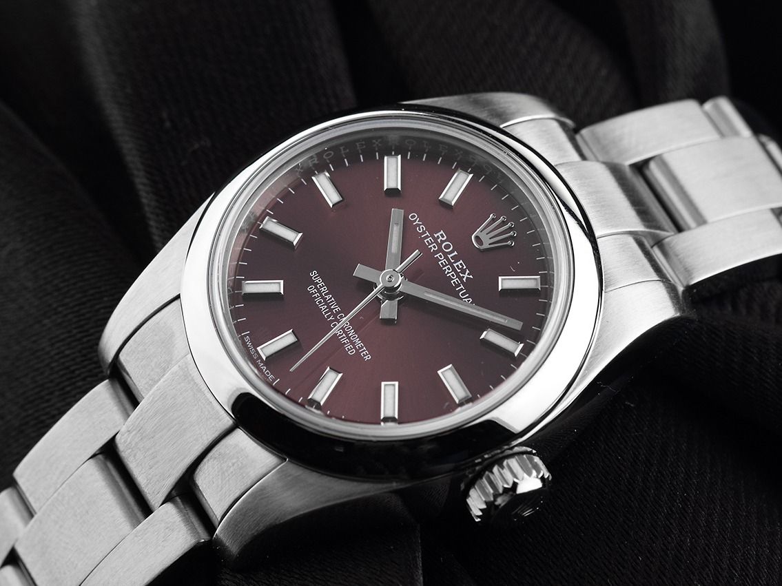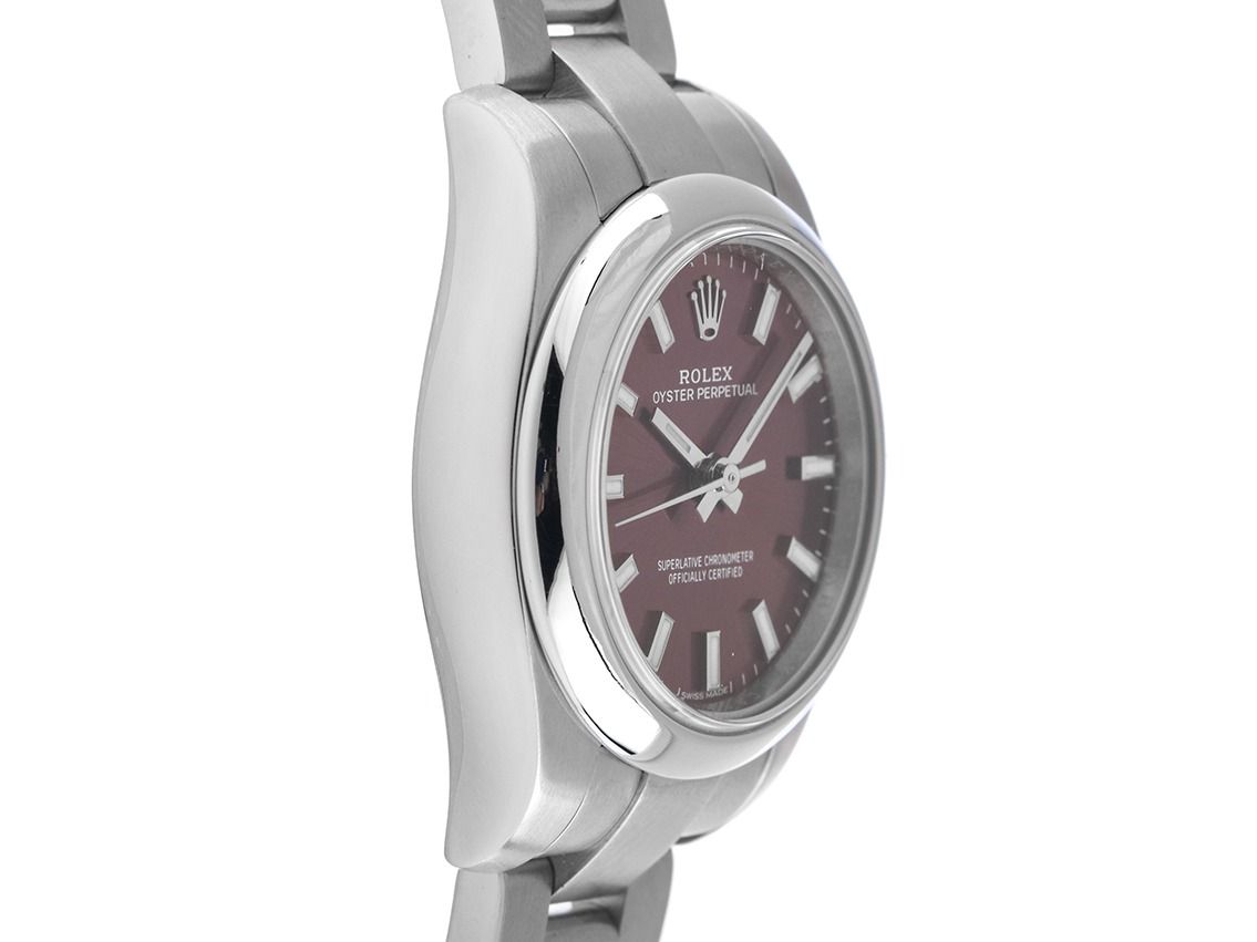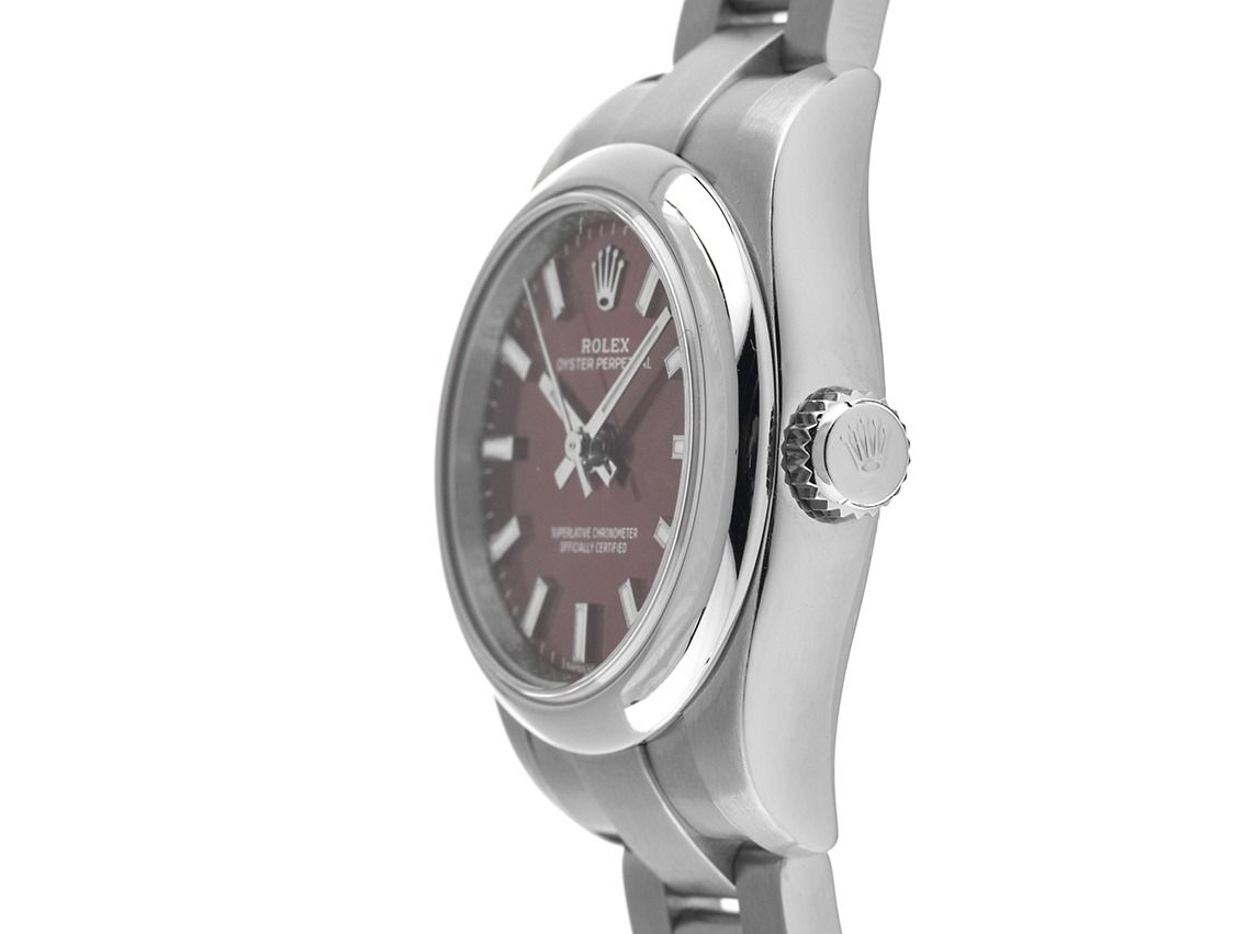 Rolex Oyster Perpetual Lady Stahl Automatik Armband OysterGehäuse Edelstahl poliert und satiniert, Gehäusedurchmesser ohne Krone 26mm, Gehäusehöhe 10,1mm. Lünette Edelstahl glatt und poliert. Armband Oyster Edelstahl poliert und satiniert, Faltschließe Edelstahl mit Hersteller-Logo. Zifferblatt purple mit aufgesetzten weißgoldenen Indexen und weißgoldenen Zeigern. Uhrwerk Automatik, Chronometer mit Zeugnis, Rolex Manufakturkaliber 2231 mit 31 Edelsteinen. Anzeige von Stunde, Minute und Sekunde über Zeiger aus der Mitte mit Sekundenstopp zur sekundengenauen Einstellung der Uhrzeit. Saphirglas kratzfest. Krone verschraubbar mit Hersteller-Logo. Boden Edelstahl verschraubt. Gewicht der Uhr inklusive Armband 67g, Länge des Armbandes inklusive Gehäuse 150mm. Referenznummer: 176200, Gehäusenummer: 82S2RXXX, ID: P202690541225H-8900, Artikelnummer: 10000083557. Mit Gangkontrolle und kompletter äußerlicher Aufarbeitung von Dezember 2025. Original Rolex Box mit Umkarton und Garantie Papiere von November 2019, LC 410 / Japan sowie Beschreibung, Ledermäppchen, Rolex Chronometer-Siegel und Watchregister Auszug von Dezember 2025, The Watch Register Zertifikat / ohne Eintrag (Internationale Datenbank für verlorene oder gestohlene Uhren), Full Set. Wie Neu. Lieferzeit sofort.