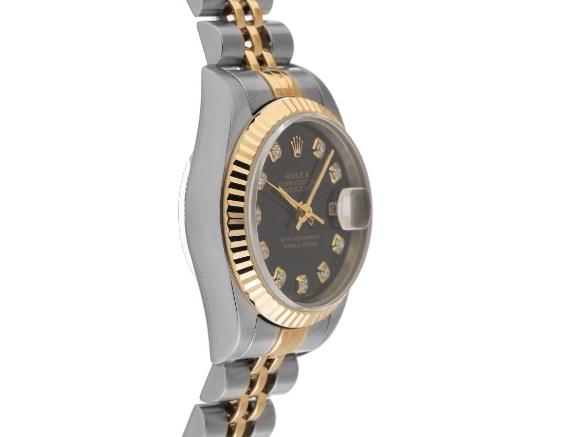 Rolex Datejust Lady Stahl 18kt Gelbgold Diamanten Automatik Armband JubiléGehäuse Edelstahl poliert und satiniert, Gehäusedurchmesser ohne Krone 26mm, Gehäusehöhe 10,6mm. Lünette 18kt Gelbgold geriffelt und poliert. Armband Jubilé Edelstahl / Gelbgold poliert und satiniert, Faltschließe Edelstahl mit Hersteller-Logo. Zifferblatt schwarz mit 10 aufgesetzten Diamantindexen und gelbgoldenen Zeigern. Uhrwerk Automatik, Chronometer mit Zeugnis, Rolex Manufakturkaliber 2135 mit 29 Edelsteinen. Anzeige von Stunde, Minute und Sekunde über Zeiger aus der Mitte mit Sekundenstopp zur sekundengenauen Einstellung der Uhrzeit, Datumsanzeige unter Glaslupe bei 3 Uhr, open 6/9 (offene 6 und 9 in der Datumsanzeige). Saphirglas kratzfest. Krone verschraubbar mit Hersteller-Logo. Boden Edelstahl verschraubt. Gewicht der Uhr inklusive Armband 54g, Länge des Armbandes inklusive Gehäuse 155mm. Referenznummer: 69173, Gehäusenummer: W277XXX, ID: P204898001225H-8900, Artikelnummer: 10000083615. Mit Gangkontrolle und kompletter äußerlicher Aufarbeitung von Dezember 2025. Original Rolex Box mit Umkarton und Garantie Papiere von Juli 1995, LC 400 / Hong Kong sowie Beschreibung, Ledermäppchen, Übersetzungsheft, Rolex Chronometer-Siege und Watchregister Auszug von Dezember 2025, The Watch Register Zertifikat / ohne Eintrag (Internationale Datenbank für verlorene oder gestohlene Uhren), Full Set. Superschnäppchen, Kapitalanlage mit Wertsteigerungspotential, sehr seltenes Sammlerstück. Sehr guter Zustand. Lieferzeit sofort.
