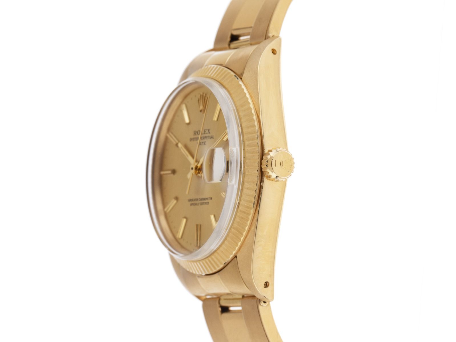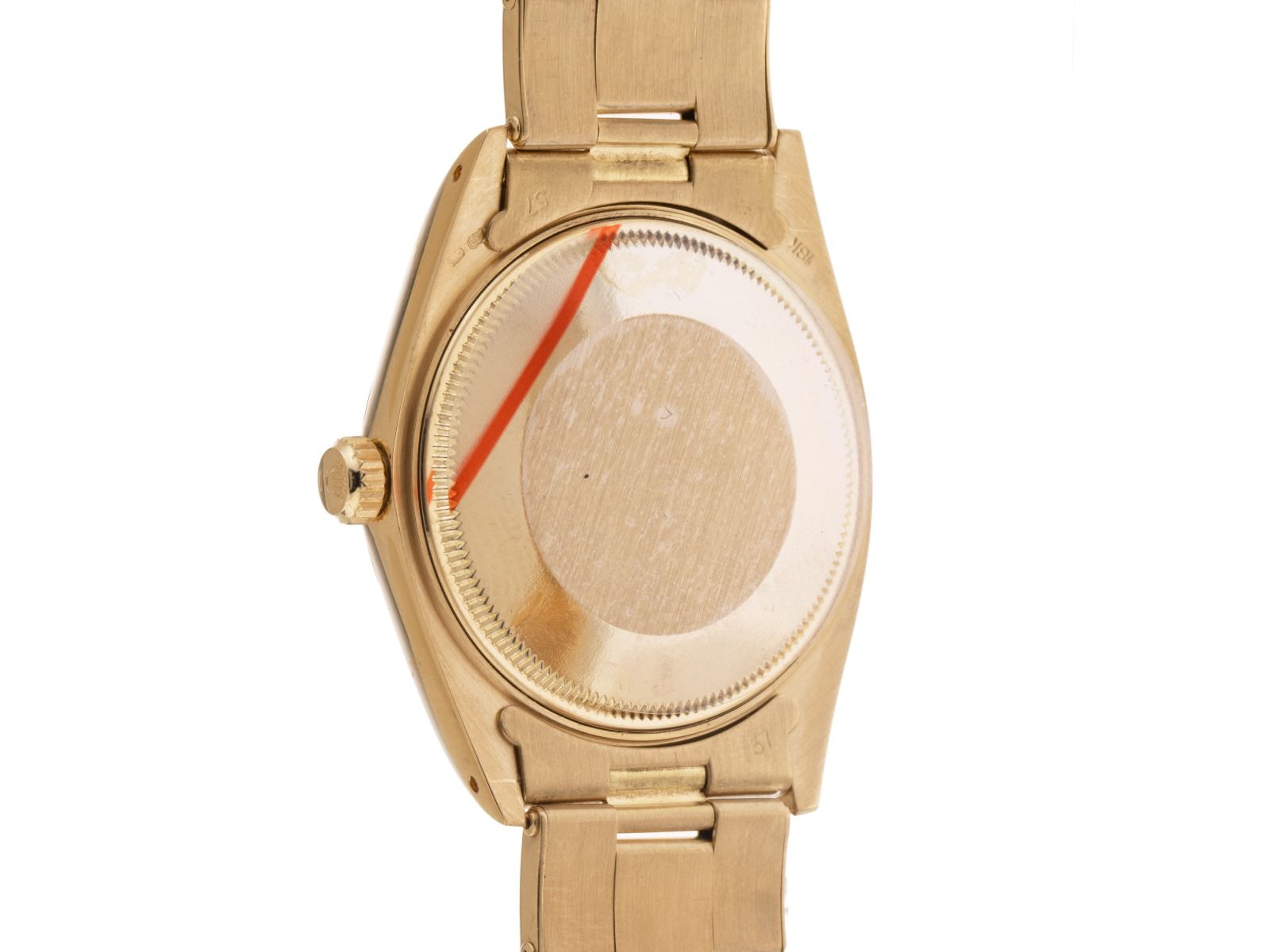 Rolex Oyster Perpetual open 6/9 18kt Gelbgold Automatik Armband 18kt Gelbgold OysterGehäuse 18kt Gelbgold poliert und satiniert, Gehäusedurchmesser ohne Krone 34mm, Gehäusehöhe 11,1mm. Lünette 18kt Gelbgold poliert und geriffelt. Armband Oyster 18kt Gelbgold poliert und satiniert, Rolex Faltschließe 18kt Gelbgold mit Hersteller-Logo. Zifferblatt champagner mit aufgesetzten gelbgoldenen Indexen und gelbgoldenen Zeigern. Uhrwerk Automatik, Chronometer, Rolex Manufakturkaliber 1570 mit 26 Edelsteinen. Anzeige von Stunde, Minute und Sekunde über Zeiger aus der Mitte, Datumsanzeige unter Glaslupe bei 3 Uhr, open 6/9 (offene 6 und 9 in der Datumsanzeige). Plexiglas. Krone verschraubbar mit Hersteller-Logo. Boden 18kt Gelbgold verschraubt. Gewicht der Uhr inklusive Armband 102g, Länge des Armbandes inklusive Gehäuse 190mm. Referenznummer 1503, Baujahr: 1980, Gehäusenummer: 6220XXX, ID: KA1760231021225H-16200, Artikelnummer: 10000083893. Mit Gangkontrolle und kompletter äußerlicher Aufarbeitung von Dezember 2025. Original Rolex Box mit Umkarton und Beschreibung, Ledermäppchen, Übersetzungsheft, Rolex Chronometer-Siegel sowie Watchregister Auszug von Dezember 2025, The Watch Register Zertifikat / ohne Eintrag (Internationale Datenbank für verlorene oder gestohlene Uhren). Superschnäppchen, sehr seltenes Sammlerstück. Sehr guter Zustand. Lieferzeit sofort.