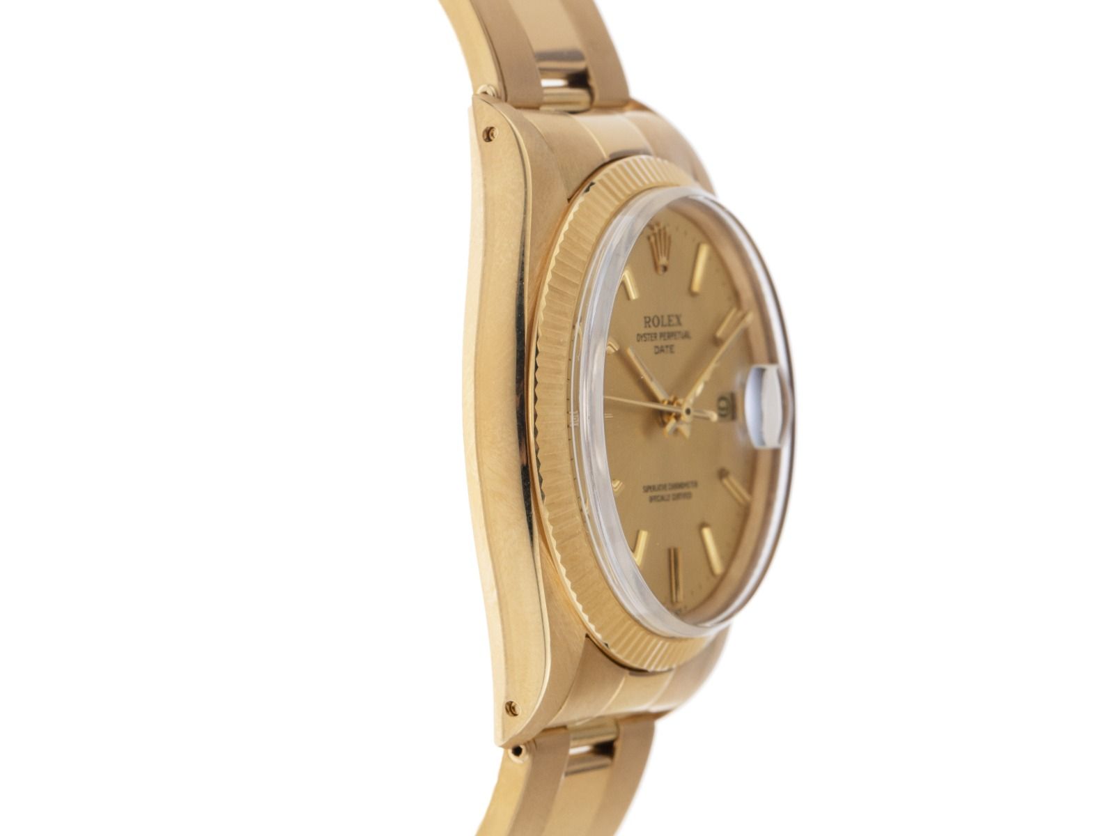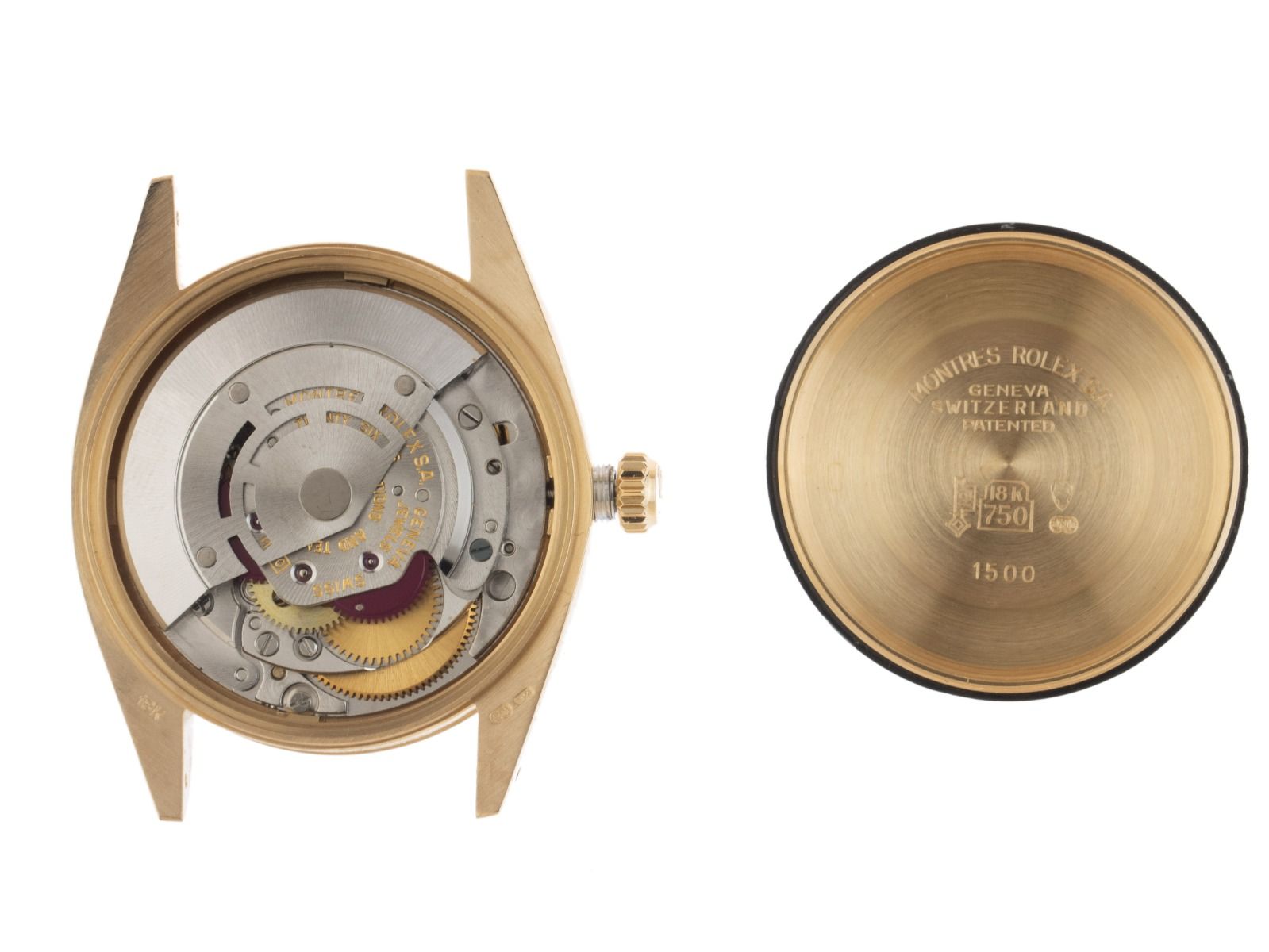 Boîtier 18kt Or jaune poli et satiné, diamètre du boîtier sans couronne 34mm, hauteur du boîtier 11,1mm. Lunette 18kt Or jaune poli et cannelé. Bracelet Oyster 18kt Or jaune poli et satiné, boucle déployante Rolex 18kt Or jaune avec logo du fabricant. Cadran champagne avec index en or jaune appliqués et aiguilles en or jaune. Mouvement automatique, chronomètre, calibre manufacture Rolex 1570 avec 26 pierres précieuses. Affichage des heures, minutes et secondes par aiguilles centrales, affichage de la date sous loupe à 3 heures, open 6/9 (6 et 9 ouvertes dans l'affichage de la date). Plexiglas. Couronne vissée avec logo du fabricant. Fond 18kt Or jaune vissé. Poids de la montre incluant le bracelet 102g, longueur du bracelet incluant le boîtier 190mm. Numéro de référence 1503, année de fabrication : 1980, numéro de boîtier : 6220XXX, ID : KA1760231021225H-16200, numéro d'article : 10000083893. Avec contrôle de marche et révision extérieure complète de décembre 2025. Boîte Rolex d'origine avec carton d'emballage et description, étui en cuir, livret de traduction, certificat de chronomètre Rolex ainsi qu'un extrait du Watch Register de décembre 2025, certificat The Watch Register / sans inscription (base de données internationale pour montres perdues ou volées). Super affaire, pièce de collection très rare. Très bon état. Délai de livraison immédiat.