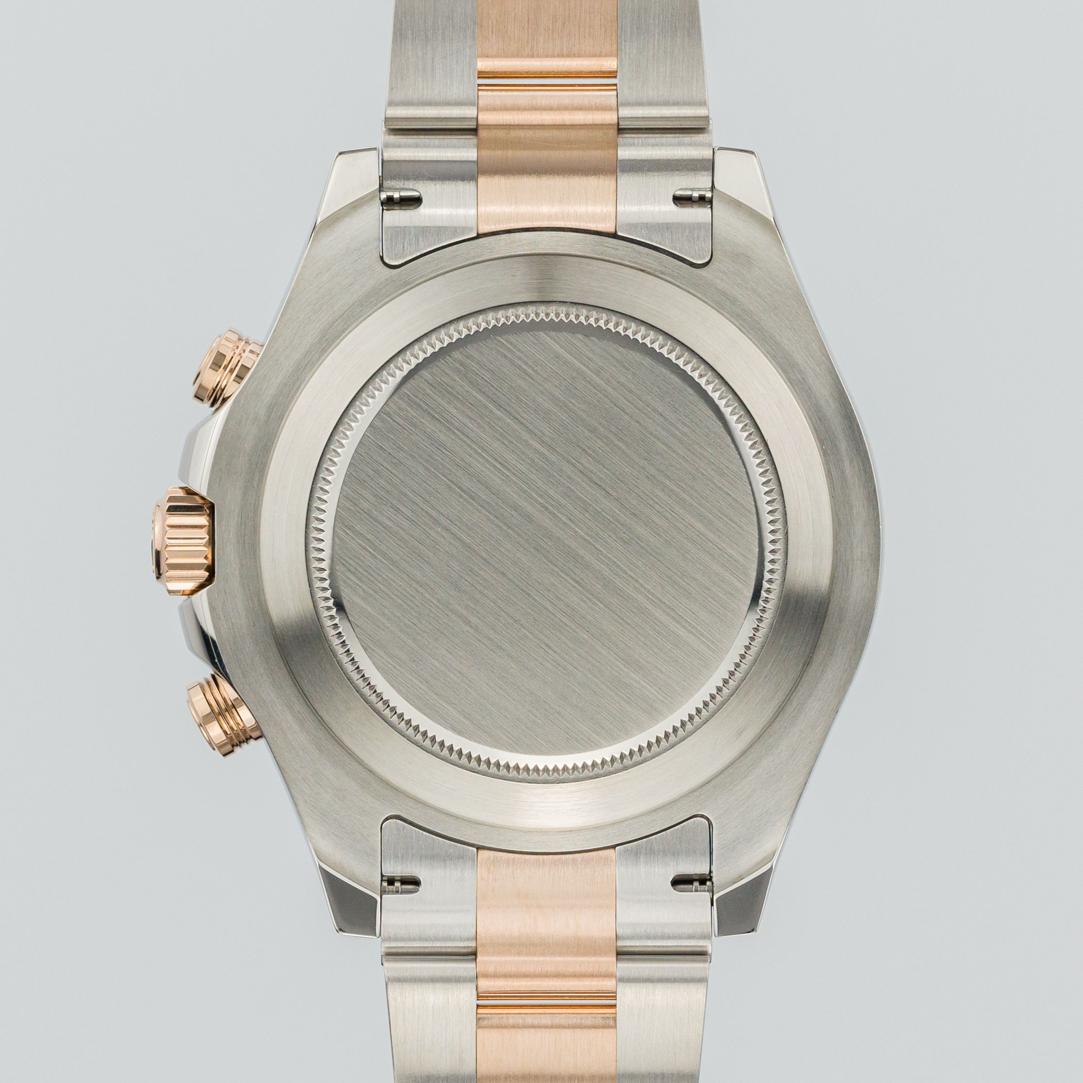 For the case back of the watch, Rolex uses a simple solid back (as, by the way, in all its models) – in this case, it is devoid of any markings, inscriptions, or other "decorations". As we all know, for its watches Rolex uses noble 904L steel; recently Rolex has been calling this alloy Oyster Steel, and in the case of this model, it is combined with Everose gold – the bezel, crown, pushers, center bracelet links, and dial elements are made of 18-carat rose gold. It is a widely known fact that Rolex can be called fanatics when it comes to the alloys they use – a large part of the metallurgical processes are done in-house to guarantee consistent quality of the raw material – many watches have passed through my hands, but I can say with absolute certainty that no other brand devotes so much attention and effort to the quality of the final product in terms of case finishing – and as a result, a unique quality and presence cannot fail to be achieved.