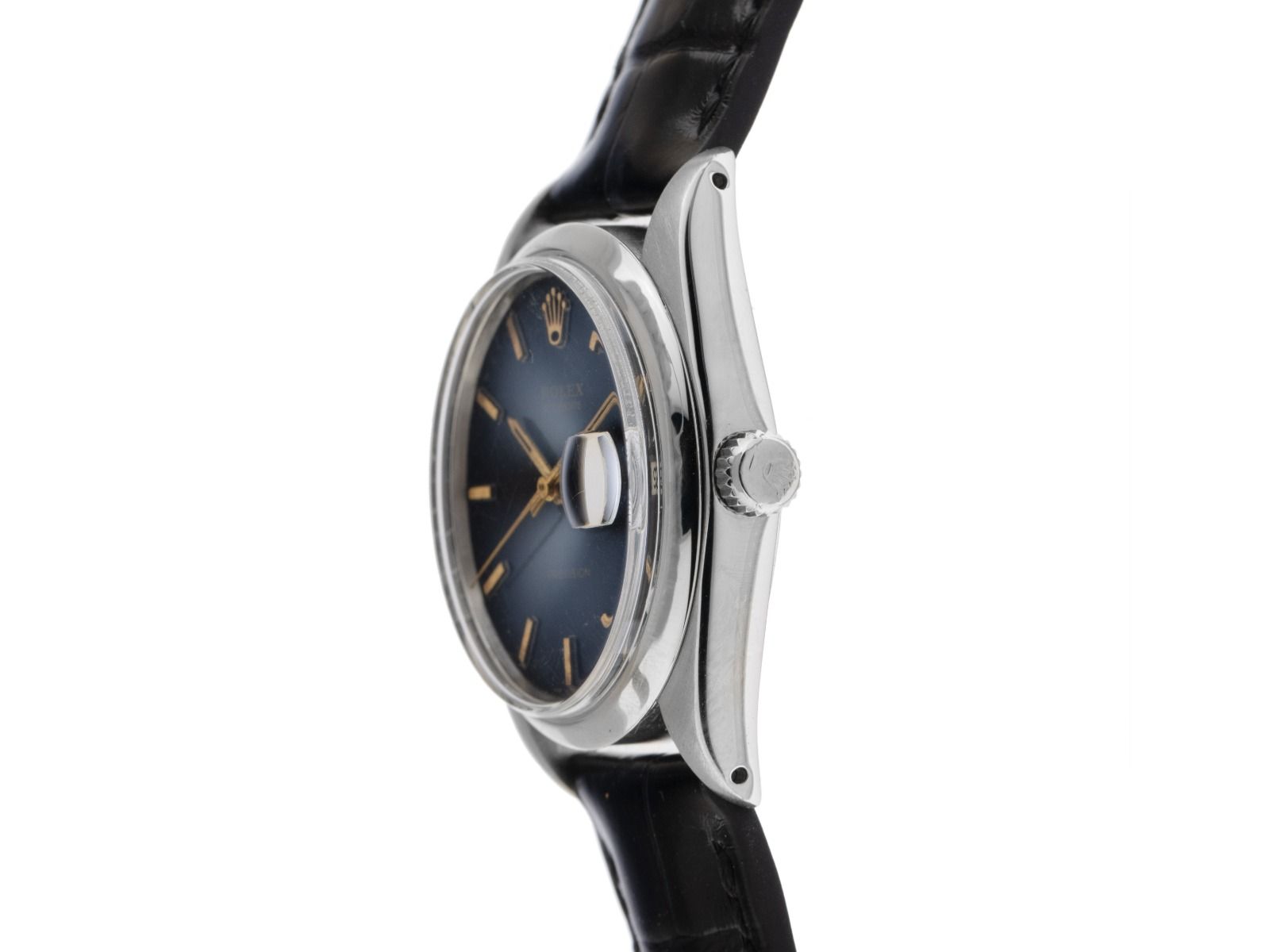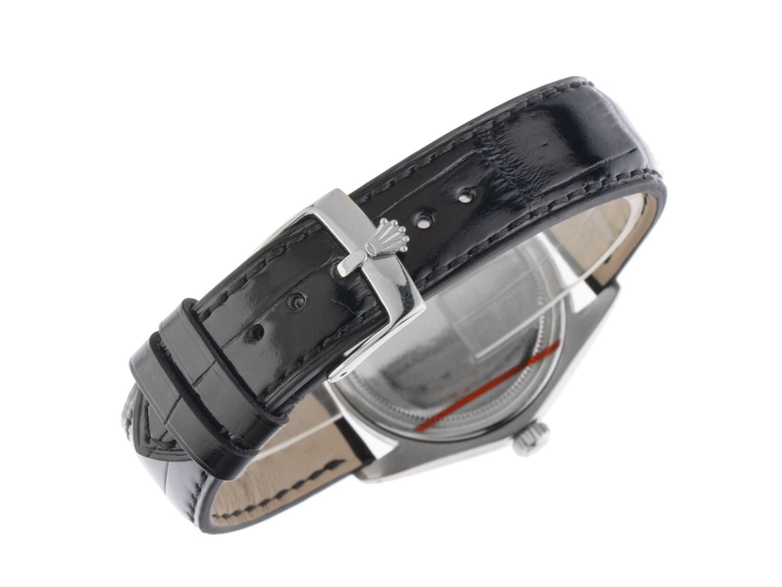 Boîtier en acier poli et satiné, diamètre du boîtier sans couronne 35mm, hauteur du boîtier 10,8mm. Lunette en acier striée et polie. Bracelet Rolex en cuir crocodile noir avec couture décorative, largeur d'attache 19mm, boucle à ardillon en acier avec logo du fabricant. Cadran noir avec légère patine, index en or jaune appliqués et aiguilles en or jaune, légère patine. Mouvement à remontage manuel, calibre manufacture Rolex 1225 avec 17 pierres précieuses. Affichage des heures, minutes et secondes par aiguilles centrales, affichage de la date sous verre loupe à 3 heures, open 6/9 (6 et 9 ouvertes dans l'affichage de la date). Plexiglas. Couronne vissée avec logo du fabricant. Fond en acier vissé. Poids de la montre avec bracelet 46g. Numéro de référence : 6694, année de fabrication : 1971, numéro de boîtier : 5492XXX, ID : P191643201125H-5200, numéro d'article : 10000083225. Avec contrôle de marche et révision complète extérieure de novembre 2025. Boîte Rolex d'origine et livret de traduction, étui en cuir ainsi qu'un extrait du registre des montres de novembre 2025, certificat The Watch Register / sans inscription (base de données internationale pour montres perdues ou volées). Super affaire, investissement avec potentiel de valorisation, pièce de collection extrêmement rare. Très bon état. Délai de livraison immédiat.