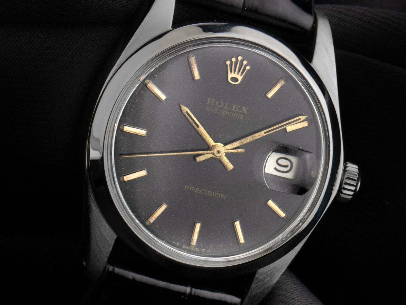 Rolex Oysterdate Precision open 6/9 Stahl Handaufzug Armband KrokolederGehäuse Edelstahl poliert und satiniert, Gehäusedurchmesser ohne Krone 35mm, Gehäusehöhe 10,8mm. Lünette Edelstahl geriffelt und poliert. Rolex Armband Krokoleder schwarz mit Ziernaht, Anstoßbreite 19mm, Rolex Stiftschließe Edelstahl mit Hersteller-Logo. Zifferblatt schwarz mit leichter Patina, aufgesetzten gelbgoldenen Indexen und gelbgoldenen Zeigern, leichte Patina. Uhrwerk Handaufzug, Rolex Manufakturkaliber 1225 mit 17 Edelsteinen. Anzeige von Stunde, Minute und Sekunde über Zeiger aus der Mitte, Datumsanzeige unter Glaslupe bei 3 Uhr, open 6/9 (offene 6 und 9 in der Datumsanzeige). Plexiglas. Krone verschraubbar mit Hersteller-Logo. Boden Edelstahl verschraubt. Gewicht der Uhr inklusive Armband 46g. Referenznummer: 6694, Baujahr: 1971, Gehäusenummer: 5492XXX, ID: P191643201125H-5200, Artikelnummer: 10000083225. Mit Gangkontrolle und kompletter äußerlicher Aufarbeitung von November 2025. Original Rolex Box und Übersetzungsheft, Ledermäppchen sowie Watchregister Auszug von November 2025, The Watch Register Zertifikat / ohne Eintrag (Internationale Datenbank für verlorene oder gestohlene Uhren). Superschnäppchen, Kapitalanlage mit Wertsteigerungspotential, extrem seltenes Sammlerstück. Sehr guter Zustand. Lieferzeit sofort.