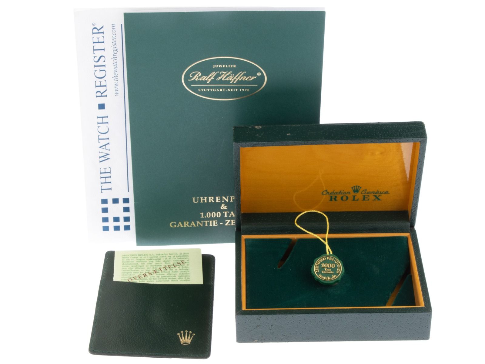 Inklusive certified pre owned Siegel / Uhrenpass mit einem Farbbild, der genauen Beschreibung sowie dem Wiederbeschaffungswert der Uhr über 5200,-€ und 1000 Tage Garantie ab Kaufdatum.