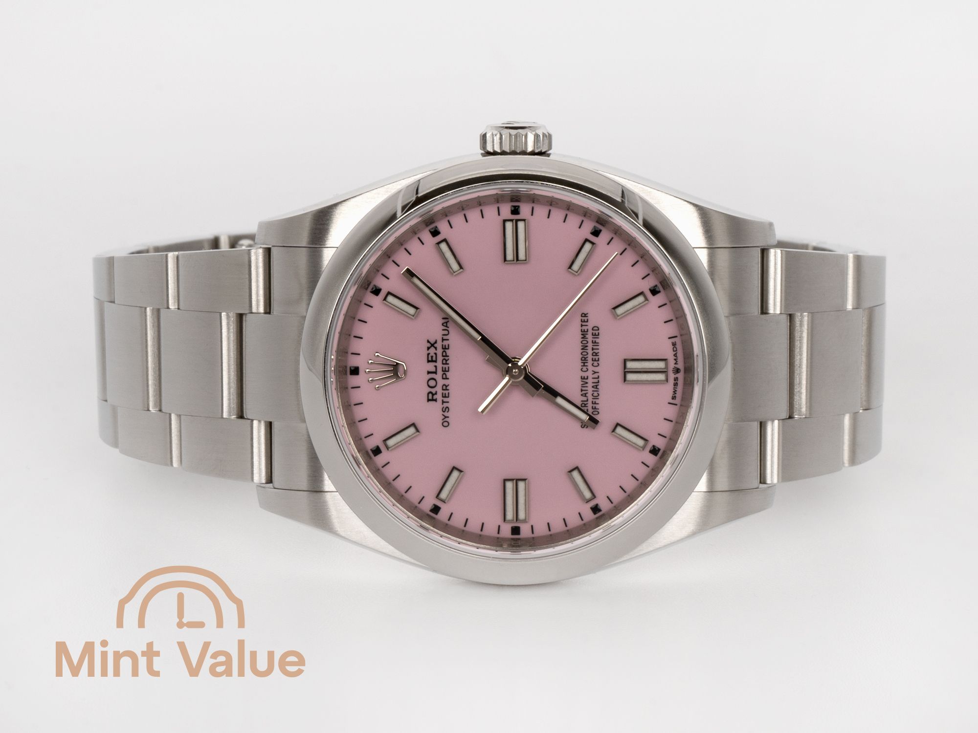 The colorful dial Oyster Perpetual models have become some of the most talked-about modern Rolex releases, with the Candy Pink configuration particularly sought after due to limited availability and strong market demand. Reference 126000 continues to demonstrate excellent liquidity and collector interest on the secondary market.