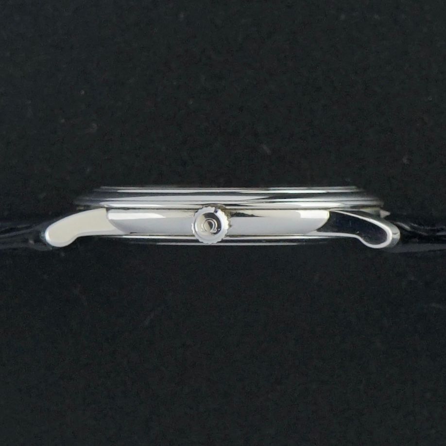 This vintage Omega De Ville Prestige from 1993 features a beautiful black textured dial with elegant silver accents and a refined small seconds complication. The stainless steel case measures 34.5mm in width and, thanks to the manual wind caliber 651 movement, is only 6.2mm thin, giving the watch a very subtle and prestigious presence on the wrist.The caliber 651 was serviced in February 2026 and currently runs and functions excellently. We have paired the watch with a brand new black top grain leather strap with a crocodile motif and light glossy finish, perfectly complementing its character.