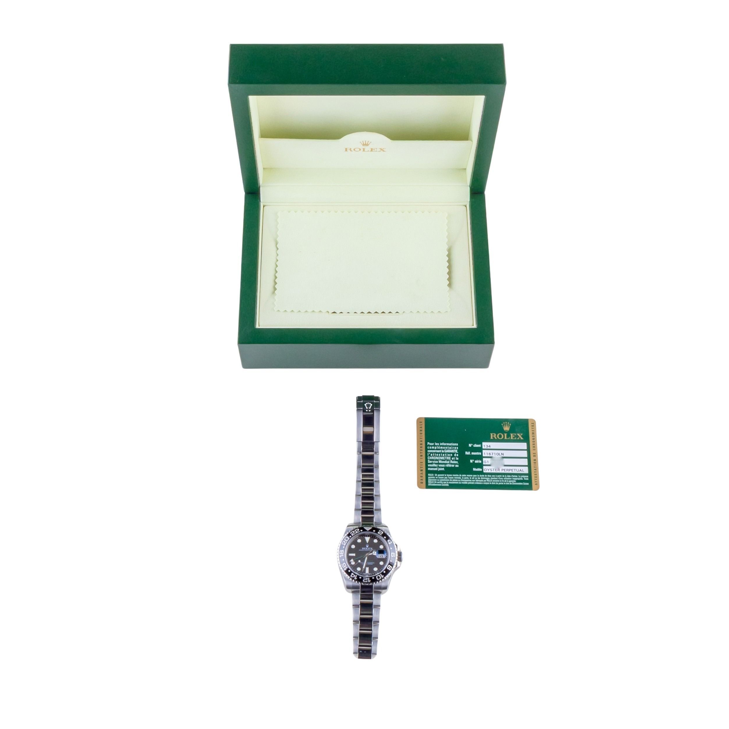 Rolex Oyster Perpetual GMT-Master II référence 116710LN de 2010, incluant la boîte et les papiers. Le GMT-Master II mesure un boîtier en acier inoxydable de 40 mm, un bracelet Oyster en acier inoxydable avec fermoir à rabat et une lunette tournante noire. Le GMT-Master II 116710LN est équipé d'un mouvement automatique calibre 3186 avec fonction GMT, d'un verre saphir résistant aux rayures et d'un cadran noir.
