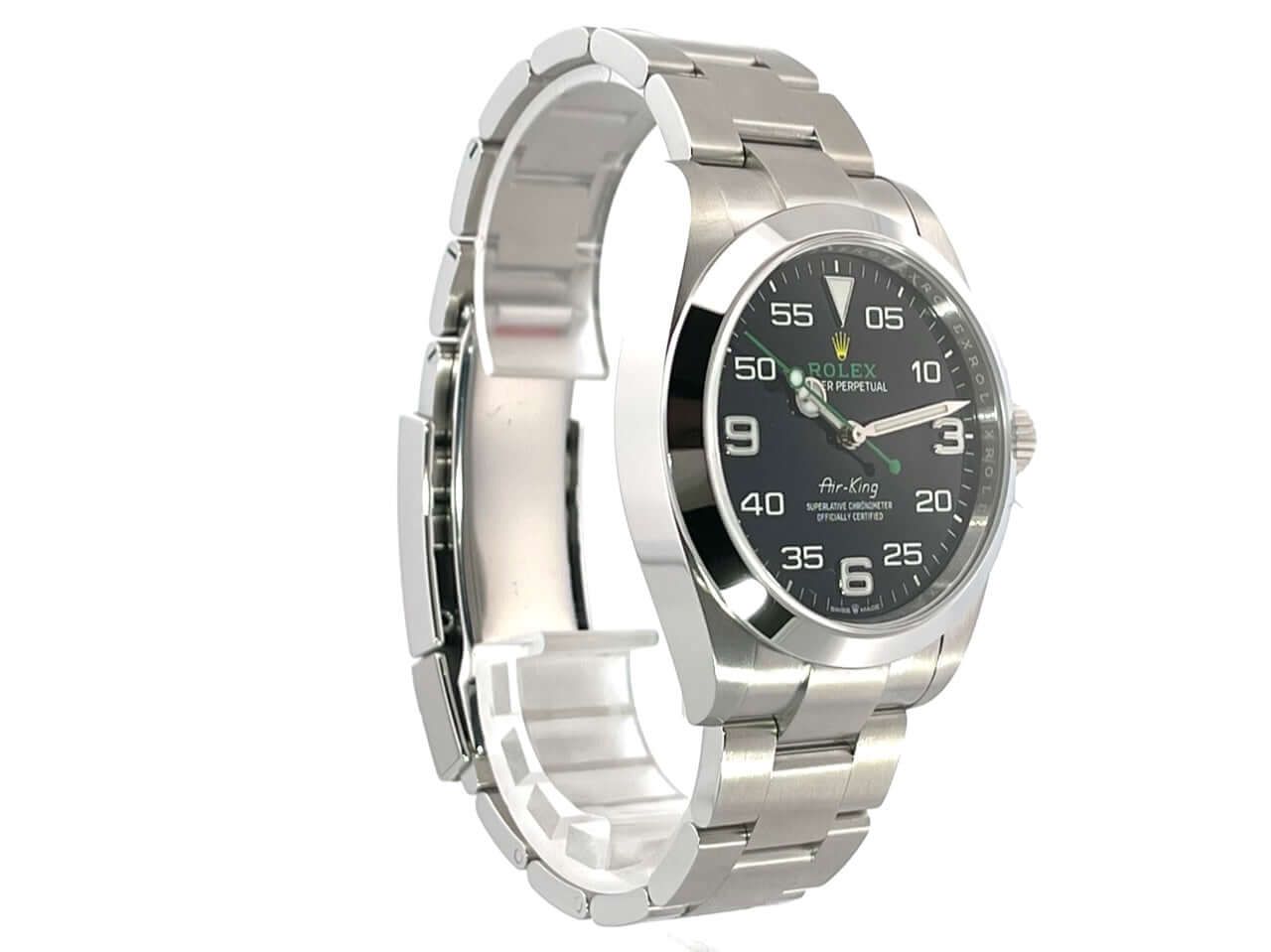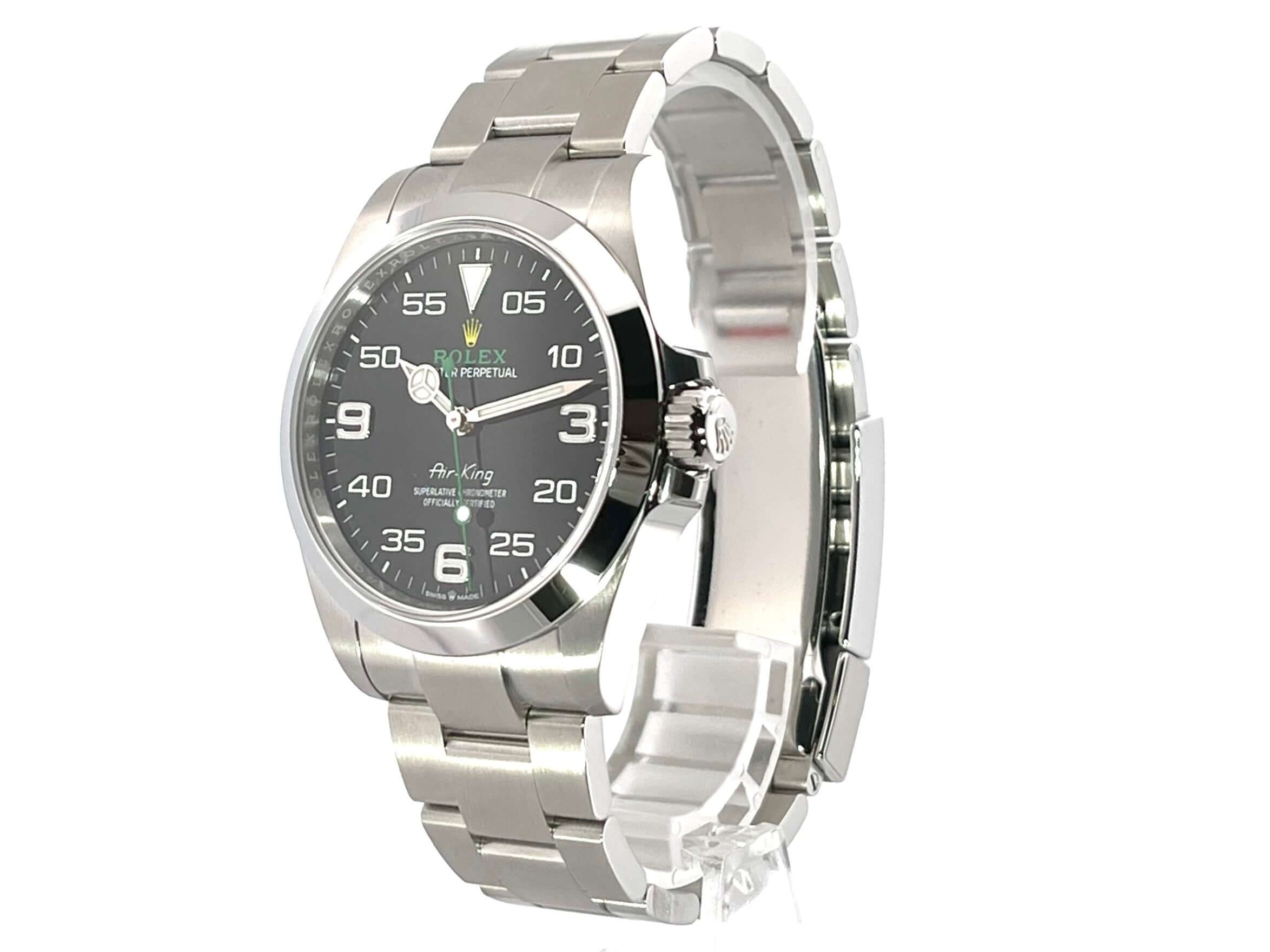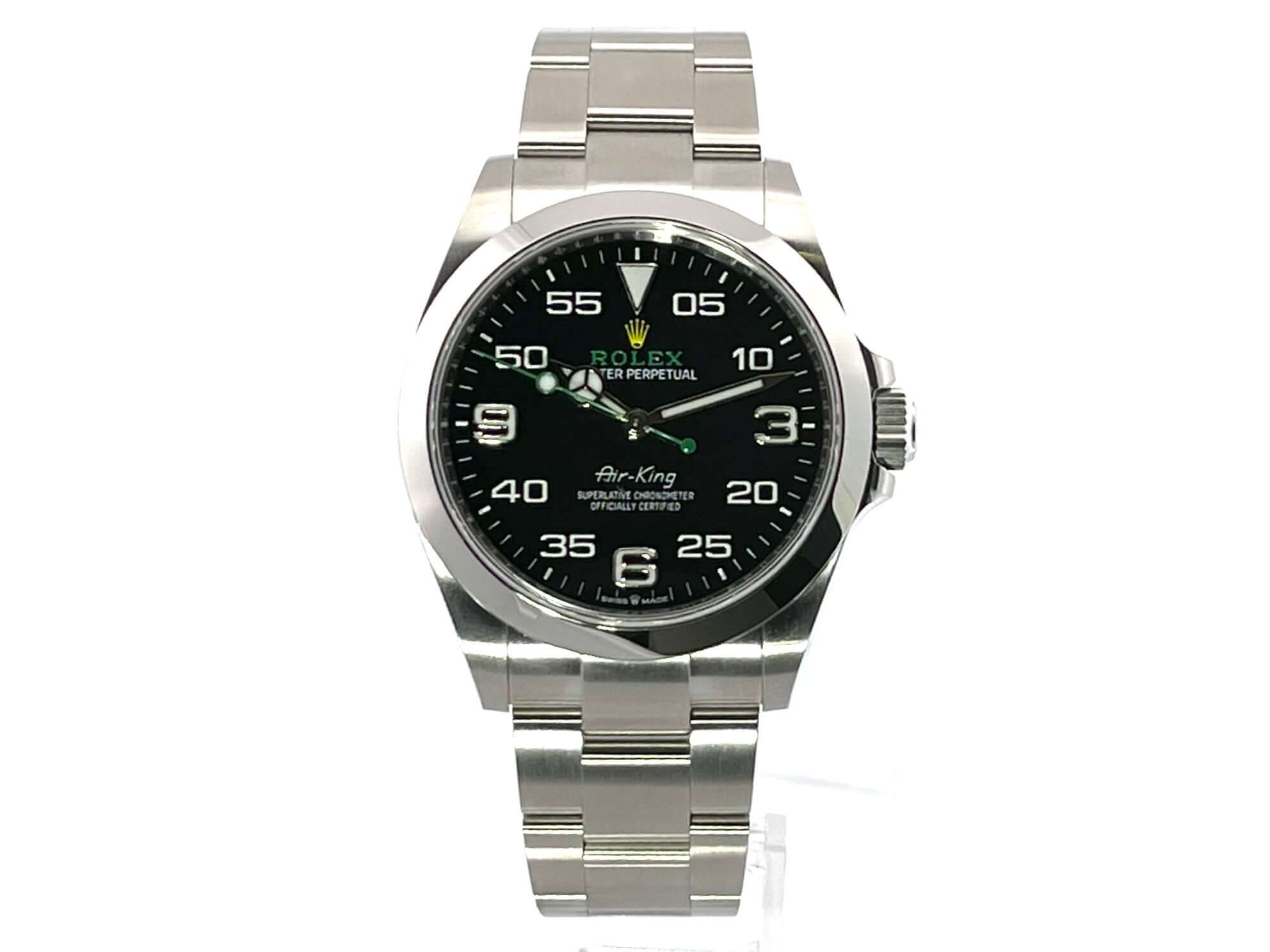 Rolex Oyster Perpetual Air-King Ref. 126900Case made of polished and satin-finished stainless steel, case diameter 40 mm, polished stainless steel bezel, Oyster stainless steel bracelet polished and satin-finished with folding clasp, black dial with applied Arabic luminous numerals and luminous markers, self-winding movement, Rolex in-house caliber 3230 with 31 jewels, 70 hours power reserve, frequency 28,800 vibrations per hour, scratch-resistant sapphire crystal, screw-down crown, green seconds hand with luminous dot, screw-down stainless steel back, water-resistant up to 10 bar.