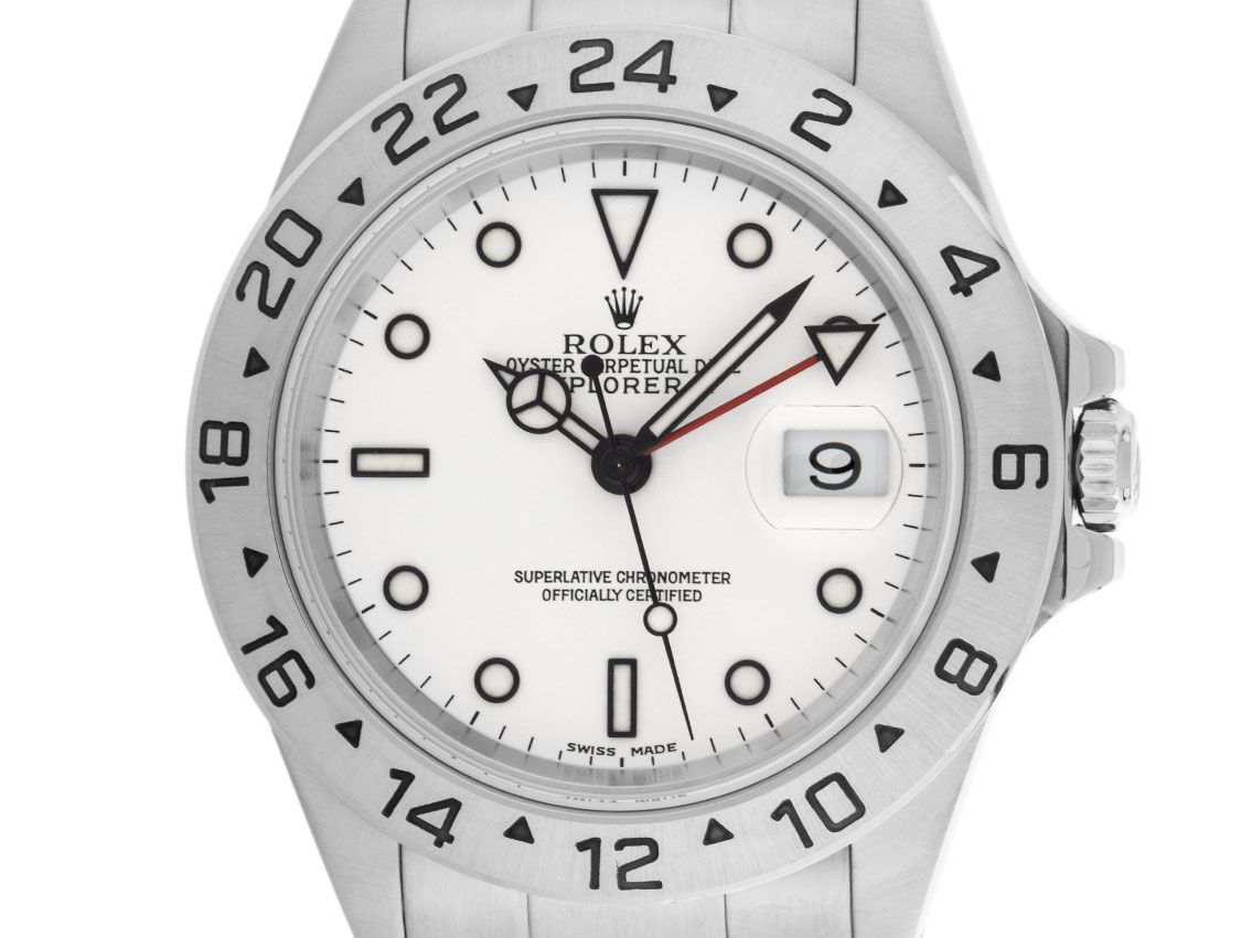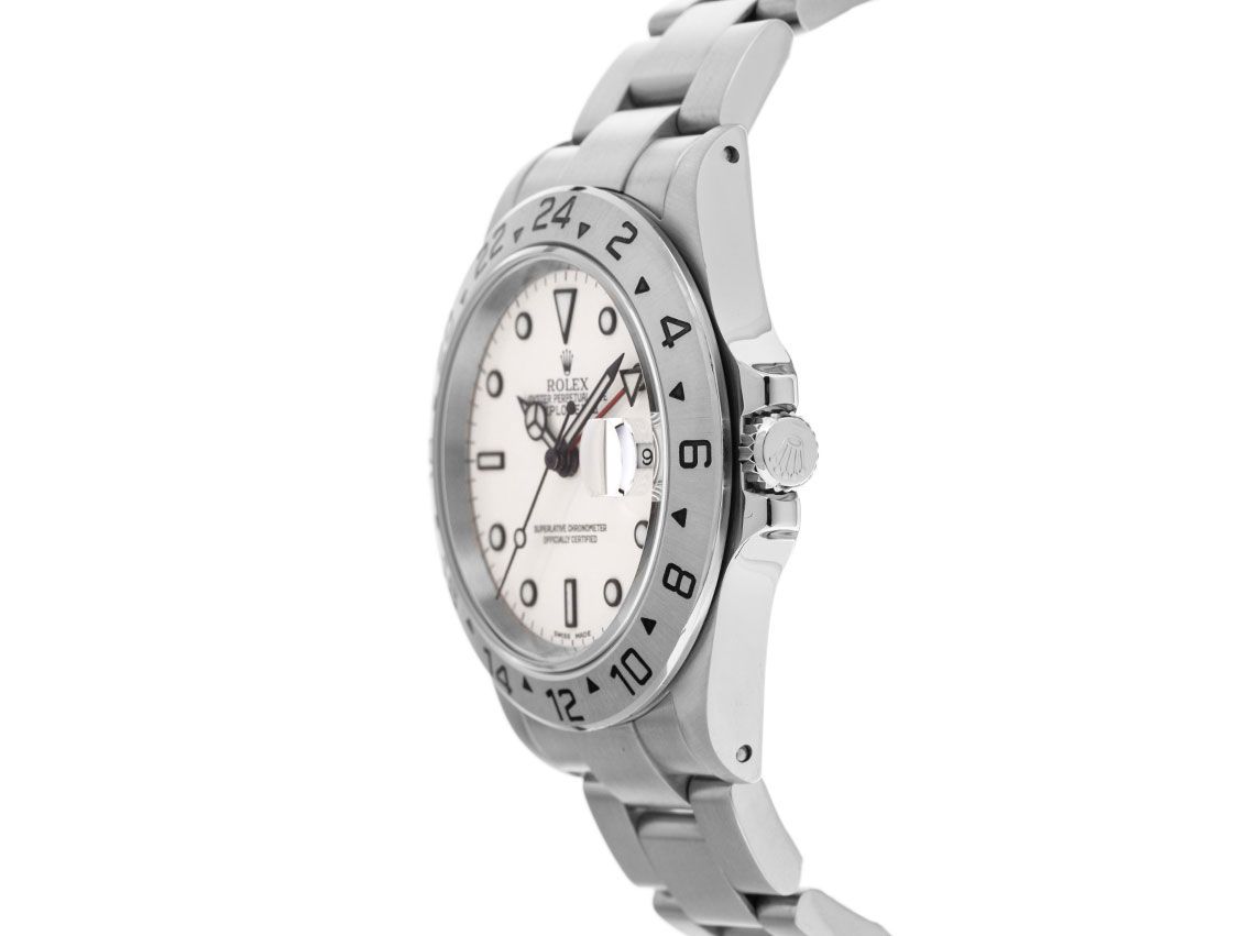 Rolex Explorer II Stahl Automatik Armband OysterGehäuse Edelstahl poliert und satiniert, Gehäusedurchmesser ohne Krone 40mm, Gehäusehöhe 12,1mm. Lünette Edelstahl satiniert mit 24-Stunden Skala. Armband Oyster Edelstahl poliert und satiniert, Faltschließe Edelstahl mit Hersteller-Logo. Zifferblatt weiß mit aufgesetzten Indexen und schwarzen Zeigern. Uhrwerk Automatik, Chronometer, Rolex Manufakturkaliber 3185 mit 31 Edelsteinen. Anzeige von Stunde, Minute und Sekunde über Zeiger aus der Mitte mit Sekundenstopp zur sekundengenauen Einstellung der Uhrzeit, Datumsanzeige mit Schnellverstellung unter Glaslupe bei 3 Uhr, zweite Zeitzone (GMT) ablesbar über Lünette, einstellbar über roten Zeiger aus der Mitte. Saphirglas kratzfest. Krone verschraubbar mit Flankenschutz und Hersteller-Logo. Boden Edelstahl verschraubt. Gewicht der Uhr inklusive Armband 120g, Länge des Armbandes inklusive Gehäuse 180mm. Referenznummer: 16570, Gehäusenummer: W273XXX, Baujahr: 1995, ID: P2573134200226H-9900, Artikelnummer: 10000084902. Mit Gangkontrolle und kompletter äußerlicher Aufarbeitung von Februar 2026. Original Rolex Box mit Umkarton sowie Beschreibung, Ledermäppchen, Rolex Chronometer-Siegel, Tag und Watchregister Auszug von Februar 2026, The Watch Register Zertifikat / ohne Eintrag (Internationale Datenbank für verlorene oder gestohlene Uhren). Superschnäppchen, Kapitalanlage mit Wertsteigerungspotential, sehr seltenes Sammlerstück. Sehr guter Zustand. Lieferzeit sofort.