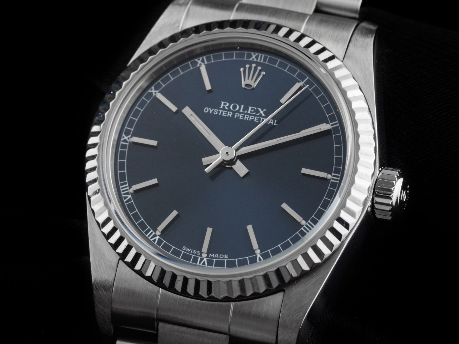 Rolex Oyster Perpetual Medium Stahl Weißgold Automatik Armband OysterGehäuse Edelstahl poliert und satiniert, Gehäusedurchmesser ohne Krone 31mm, Gehäusehöhe 10,0mm. Lünette 18kt Weißgold geriffelt und poliert. Armband Oyster Edelstahl poliert und satiniert, Faltschließe Edelstahl mit Hersteller-Logo. Zifferblatt blau mit aufgesetzten Edelstahl Indexen und Edelstahl Zeigern. Uhrwerk Automatik, Chronometer mit Zeugnis, Rolex Manufakturkaliber 2230 mit 31 Edelsteinen. Anzeige von Stunde, Minute und Sekunde über Zeiger aus der Mitte mit Sekundenstopp zur sekundengenauen Einstellung der Uhrzeit. Saphirglas kratzfest. Krone verschraubbar mit Hersteller-Logo. Boden Edelstahl verschraubt. Gewicht der Uhr inklusive Armband 77g, Länge des Armbandes inklusive Gehäuse 180mm. Referenznummer: 77014, Baujahr 2005, Gehäusenummer: D998XXX, ID: P254170000226H-7900, Artikelnummer: 10000084859. Mit Gangkontrolle und kompletter äußerlicher Aufarbeitung von Februar 2026. Original Rolex Box mit Umkarton und Garantie Papiere von Juli 2006, LC 100 / Germany EU sowie Beschreibung, Übersetzungsheft, Ledermäppchen und Watchregister Auszug von Februar 2026, The Watch Register Zertifikat / ohne Eintrag (Internationale Datenbank für verlorene oder gestohlene Uhren), Full Set. Superschnäppchen, Kapitalanlage mit Wertsteigerungspotential, sehr seltenes Sammlerstück, fast nicht getragen. Sehr guter Zustand. Lieferzeit sofort.