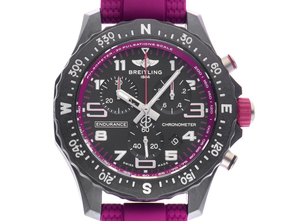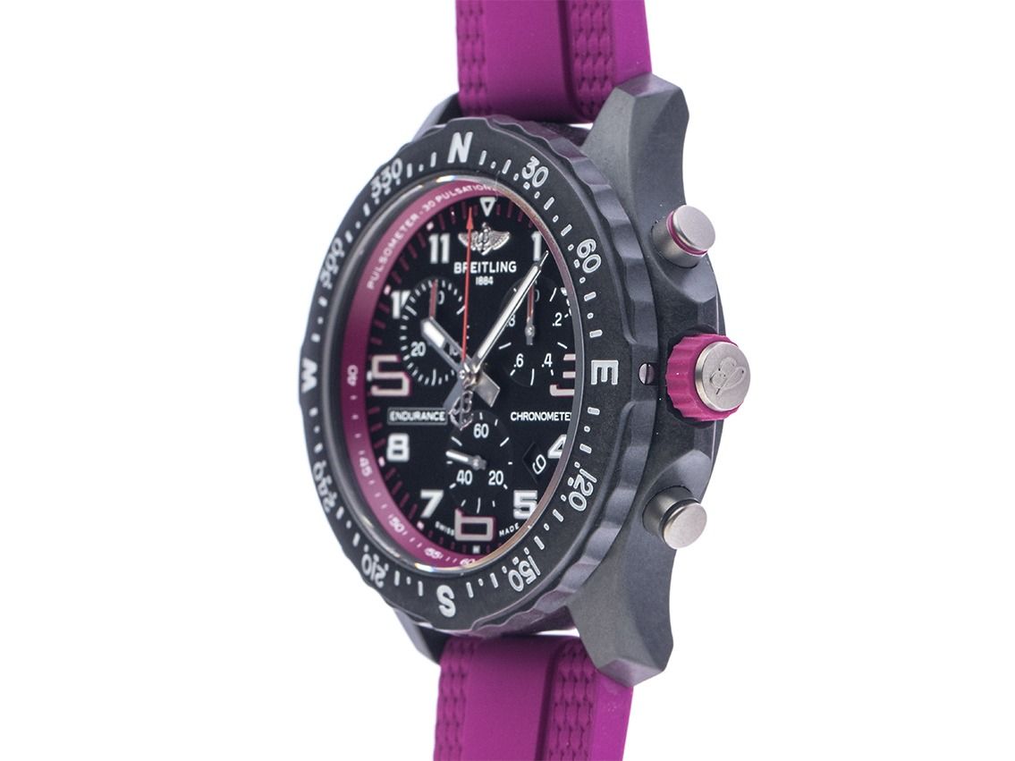 Breitling Endurance Pro Breitlight® Superquarz Chronograph Armband KautschukGehäuse Breitlight® satiniert, Gehäusedurchmesser ohne Krone 38mm, Gehäusehöhe 12,1mm. Lünette Breitlight® mit Windrose, beidseitig drehbar. Armband Kautschuk lila, Anstoßbreite 18mm, Stiftschließe Breitlight® mit Hersteller-Logo. Zifferblatt schwarz mit aufgesetzten arabischen Ziffern und Edelstahl Leuchtzeigern. Uhrwerk Superquartz thermokompensiertes Werk, Chronometer mit Zeugnis, Kaliber Breitling 83 mit 6 Edelsteinen. Anzeige von Stunde und Minute über Zeiger aus der Mitte, kleine Sekunde mit Sekundenstopp zur sekundengenauen Einstellung der Uhrzeit bei 6 Uhr, Datumsanzeige mit Schnellverstellung zwischen 4 und 5 Uhr. Saphirglas kratzfest und doppelseitig entspiegelt. Krone mit Flankenschutz und Hersteller-Logo, 2 Dichtungen. Boden Breitlight® 4-fach verschraubt und graviert. Gewicht der Uhr inklusive Armband 46g. Wasserdicht bis 10 ATM. Referenznummer: X83310F61B1S1, ID: ST116045560525H-3450, Artikelnummer: 10000080262. Original Breitling Box und Garantie Papiere von 2025 sowie Beschreibung, Full Set. Ungetragen. Lieferzeit sofort.