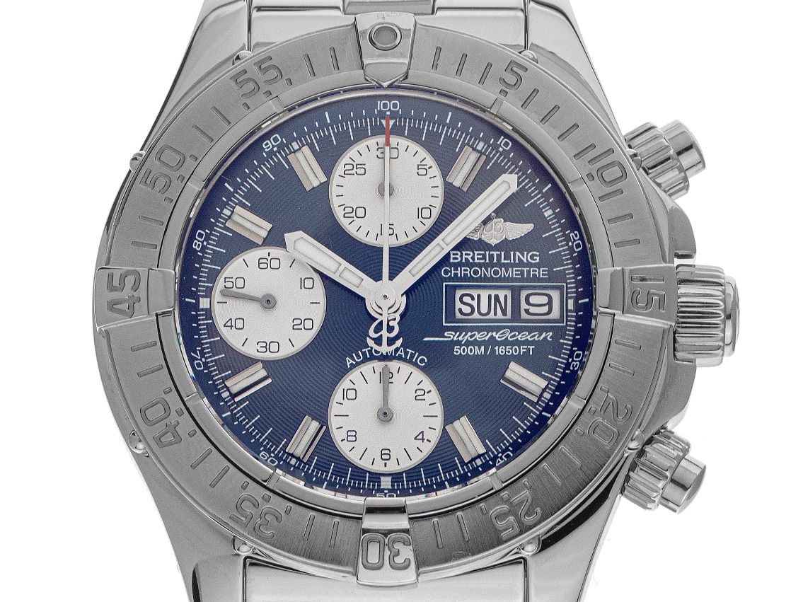 Breitling Superocean Stahl Automatik Chronograph Armband StahlGehäuse Edelstahl poliert, Gehäusedurchmesser ohne Krone 42mm, Gehäusehöhe 17,2mm. Lünette Edelstahl poliert und satiniert mit 60-Minuten Skala, einseitig drehbar. Armband Edelstahl poliert, Sicherheitsfaltschließe Edelstahl mit Hersteller-Logo. Zifferblatt blau guillochiert mit aufgesetzten Edelstahl Indexen und Edelstahl Zeigern. Uhrwerk Automatik, Chronograph, Kaliber B13 mit 25 Edelsteinen. Anzeige von Stunde und Minute über Zeiger aus der Mitte, kleine Sekunde mit Sekundenstopp zur sekundengenauen Einstellung der Uhrzeit bei 9 Uhr, Wochentagsanzeige in Englisch und Datumsanzeige mit Schnellverstellung bei 3 Uhr. Saphirglas kratzfest. Krone verschraubbar mit Flankenschutz und Hersteller-Logo. Boden Edelstahl verschraubt und graviert. Gewicht der Uhr inklusive Armband 200g, Länge des Armbandes inklusive Gehäuse 190mm. Referenznummer: A13340, Gehäusenummer: 2246XXX, ID: P250240000226H-5800, Artikelnummer: 10000084772. Mit Gangkontrolle und kompletter äußerlicher Aufarbeitung von Februar 2026. Original Breitling Box mit Umkarton und Garantie Papiere von Mai 2007 sowie Watchregister Auszug von Februar 2026, The Watch Register Zertifikat / ohne Eintrag (Internationale Datenbank für verlorene oder gestohlene Uhren), Full Set. Superschnäppchen, fast nicht getragen. Sehr guter Zustand. Lieferzeit sofort.