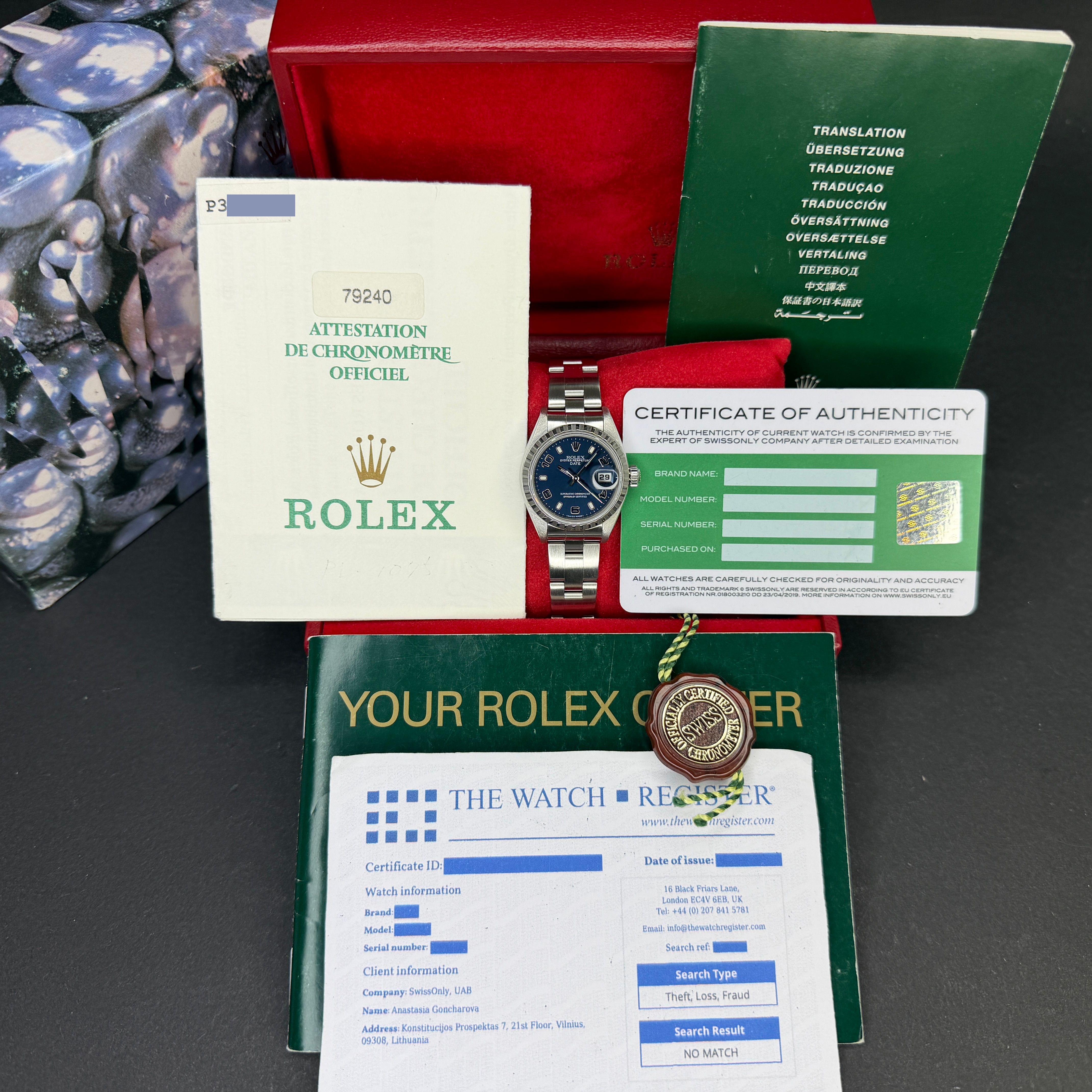 This Rolex Oyster Perpetual Lady Date 79240 features a Blue Arabic dial and is crafted from stainless steel, with a production year of 2000.Case No: P30XXXX