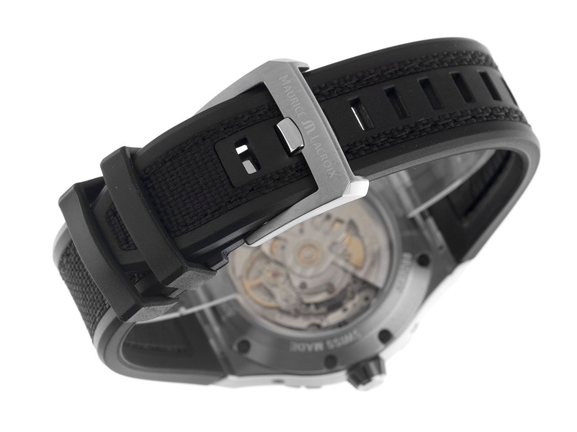 Boîtier en acier poli et satiné, diamètre du boîtier sans couronne 43mm, hauteur du boîtier 13,0mm. Lunette en céramique polie et satinée avec rehauts. Bracelet en caoutchouc noir, largeur des cornes 26mm, boucle ardillon en acier inoxydable avec logo du fabricant. Cadran anthracite squeletté avec index en acier inoxydable appliqués et aiguilles en acier inoxydable ainsi que bleues. Mouvement automatique, calibre ML291 de la manufacture Maurice Lacroix avec 47 pierres précieuses, réserve de marche d'environ 38 heures. Affichage des heures et des minutes par aiguilles centrales, petite seconde avec stop-seconde pour un réglage précis de l'heure à 9 heures, affichage rétrograde de 24 heures à 12 heures, réglable via un poussoir à 1 heure, affichage rétrograde de la date à 6 heures, réglable via un poussoir à 7 heures, affichage rétrograde du jour de la semaine réglable via un poussoir à 4 heures. Verre saphir résistant aux rayures. Couronne vissée. Fond en acier inoxydable vissé 7 fois et gravé avec fenêtre en verre saphir. Poids de la montre avec bracelet 135g. Numéro de référence : AC6068-SSL20-230-2, ID : ST197589260326H-7500, numéro d'article : 10000084943. Original Maurice Lacroix remontoir avec boîte extérieure, adaptateur secteur et papiers de garantie ainsi qu'un outil de réglage, Full Set. Neuf. Délai de livraison immédiat.