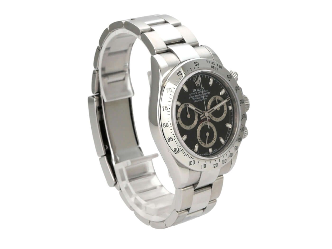 Boîtier en acier inoxydable poli et satiné, lunette en acier inoxydable poli avec échelle tachymétrique, bracelet Oyster en acier inoxydable poli et satiné avec fermoir déployant de sécurité, cadran noir, aiguilles luminescentes, calibre 4130 de manufacture Rolex, 44 rubis, réserve de marche d'environ 72 heures, chronomètre, verre saphir, couronne vissée avec protection latérale, fond en acier inoxydable vissé, étanche jusqu'à 10 bars.