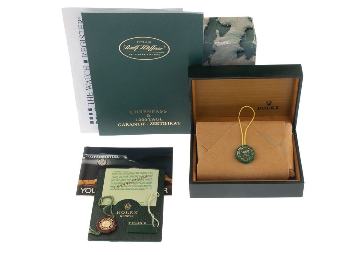 Inklusive certified pre owned Zertifikat / Uhrenpass mit einem Farbbild, der genauen Beschreibung sowie dem Wiederbeschaffungswert der Uhr über 6200,-€ und 1000 Tage Garantie ab Kaufdatum.