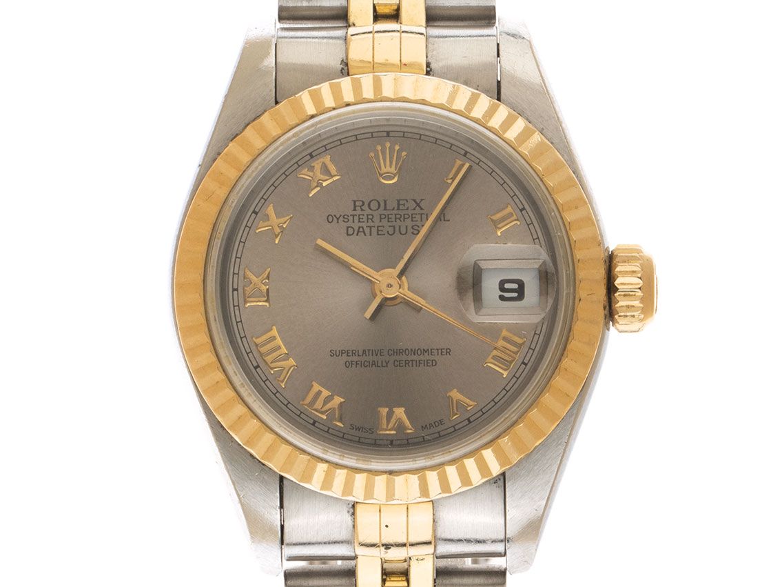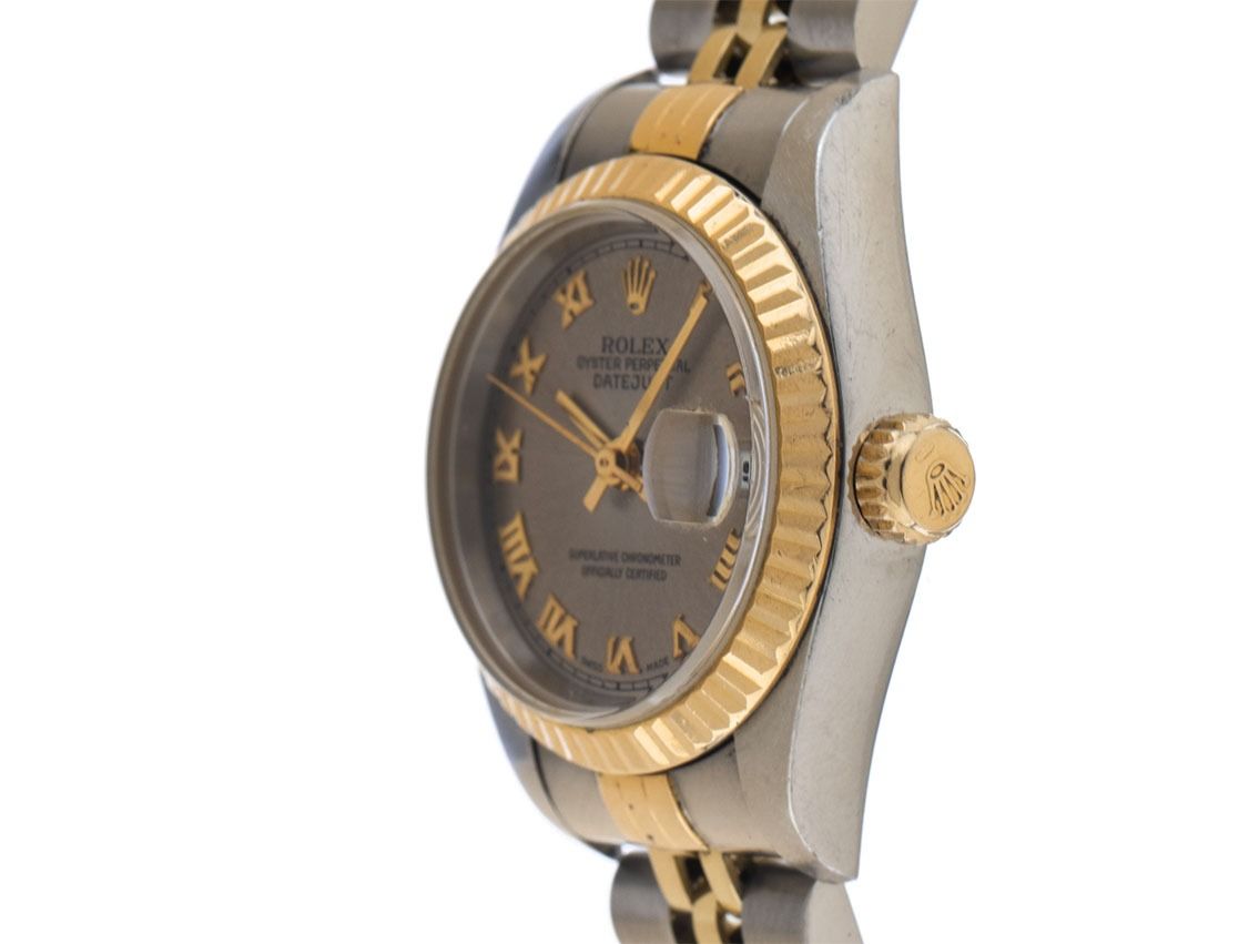 Rolex Datejust Lady Stahl 18kt Gelbgold Automatik Armband JubiléGehäuse Edelstahl poliert und satiniert, Gehäusedurchmesser ohne Krone 26mm, Gehäusehöhe 10,5mm. Lünette 18kt Gelbgold geriffelt und poliert. Armband Jubilé Edelstahl / 18kt Gelbgold poliert und satiniert, Faltschließe Edelstahl mit Hersteller-Logo. Zifferblatt Rhodium mit aufgesetzten gelbgoldenen römischen Ziffern und gelbgoldenen Zeigern. Uhrwerk Automatik, Chronometer mit Zeugnis, Rolex Manufakturkaliber 2235 mit 31 Edelsteinen. Anzeige von Stunde, Minute und Sekunde über Zeiger aus der Mitte mit Sekundenstopp zur sekundengenauen Einstellung der Uhrzeit, Datumsanzeige mit Schnellverstellung unter Glaslupe bei 3 Uhr. Saphirglas kratzfest. Krone verschraubbar mit Hersteller-Logo. Boden Edelstahl verschraubt. Gewicht der Uhr inklusive Armband 53g, Länge des Armbandes inklusive Gehäuse 150mm. Referenznummer: 79173, Gehäusenummer: A535XXX, Baujahr: 1998, ID: P258950000326H-7100, Artikelnummer: 10000084940. Original Rolex Box und Garantie Papiere von Mai 2000, LC 100 / Germany EU sowie Beschreibung, Ledermäppchen, Übersetzungsheft, Rolex Chronometer-Siegel und Watchregister Auszug von März 2026, The Watch Register Zertifikat / ohne Eintrag (Internationale Datenbank für verlorene oder gestohlene Uhren), Full Set. Original unpoliert, kann auf Wunsch kostenlos aufgearbeitet werden. Lieferzeit sofort.