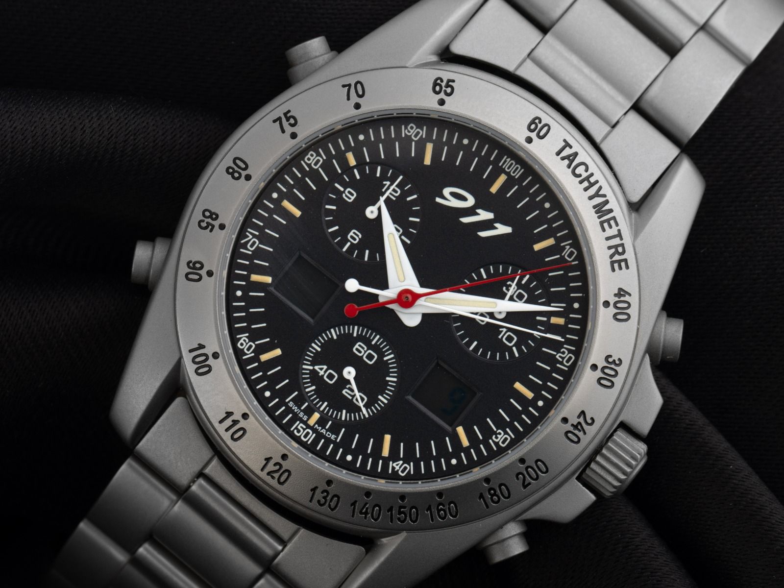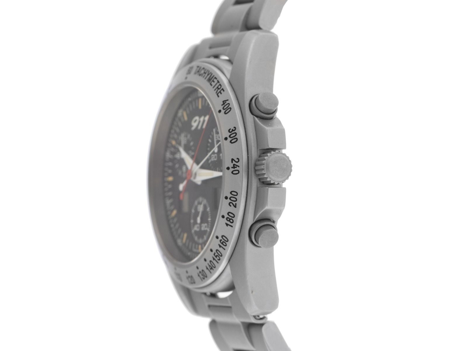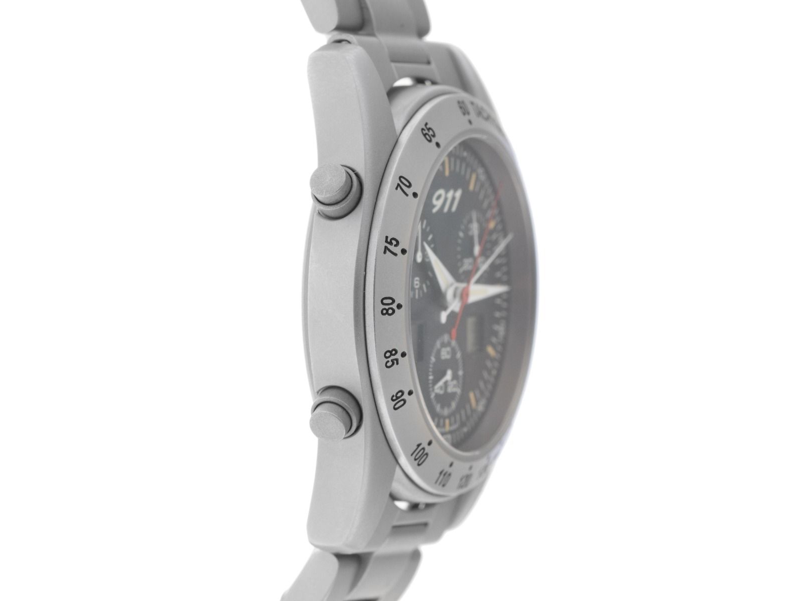 Boîtier en titane satiné, diamètre du boîtier sans couronne 42 mm, hauteur du boîtier 14,5 mm. Lunette en titane avec échelle tachymétrique gravée. Bracelet en titane satiné, fermoir déployant de sécurité avec logo du fabricant. Cadran noir avec index et aiguilles blanches. Mécanisme à quartz, chronographe, calibre ETA251252 avec 27 pierres précieuses. Affichage de l'heure et des minutes par aiguilles centrales, petite seconde avec arrêt de seconde pour un réglage précis de l'heure à 6 heures, affichage de la date par écran numérique à 3 heures, écran LCD à droite pour contrôler la fonction start-stop, via le poussoir à 2 heures, écran LCD à gauche affichant jusqu'à 99 temps différents. Verre saphir. Couronne vissée avec logo du fabricant. Fond en titane vissé et gravé. Poids de la montre incluant le bracelet 130 g, longueur du bracelet incluant le boîtier 175 mm. Numéro de référence : 1106.41, ID : P25078000226HW-2900, numéro d'article : 10000084764. Boîte d'origine Porsche Design et papiers de garantie de mars 2005 ainsi que description et extrait du registre des montres de février 2026, certificat The Watch Register / sans inscription (base de données internationale pour montres perdues ou volées), ensemble complet. Original non poli, peut être remis à neuf gratuitement sur demande. Délai de livraison immédiat.