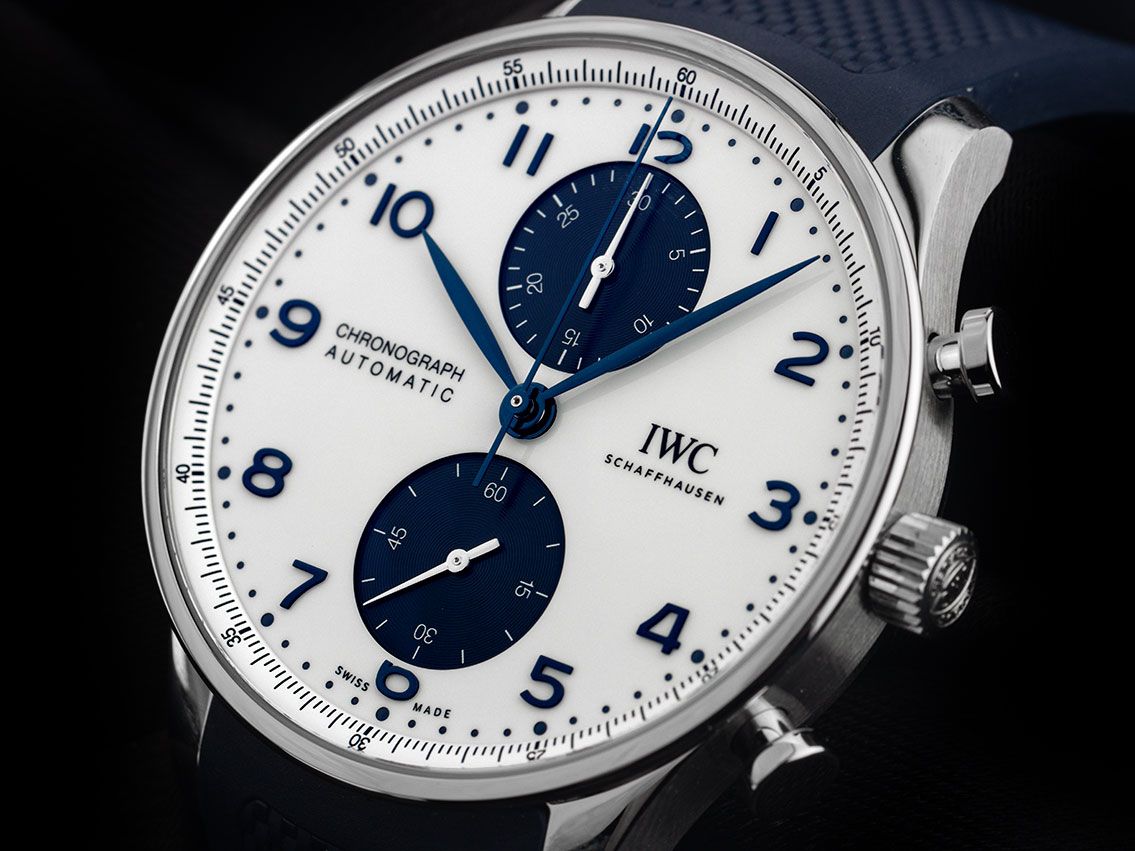 Boîtier en acier inoxydable poli et satiné, diamètre du boîtier sans couronne 41mm, hauteur du boîtier 13,0mm. Lunette en acier inoxydable lisse et poli. Bracelet IWC en caoutchouc bleu, largeur des cornes 20mm, boucle déployante à double sécurité en acier inoxydable avec logo du fabricant. Cadran argenté avec chiffres arabes bleuis appliqués et aiguilles bleuies. Mouvement automatique, chronographe, mouvement manufacture IWC 69355 avec 27 pierres précieuses, réserve de marche d'environ 46 heures. Affichage des heures et des minutes par aiguilles centrales, petite seconde avec stop-seconde pour un réglage précis de l'heure à 6 heures. Verre saphir résistant aux rayures. Couronne avec logo du fabricant. Fond en acier inoxydable vissé à 4 reprises et gravé avec un verre saphir transparent. Poids de la montre avec bracelet 108g. Étanche jusqu'à 3 ATM. Numéro de référence : IW371620, ID : ST1160130280326H-9100, numéro d'article : 10000085055. Boîte IWC originale avec carton d'emballage et papiers de garantie de février 2026 ainsi que description et chiffon de polissage, ensemble complet. Non porté. Délai de livraison immédiat.