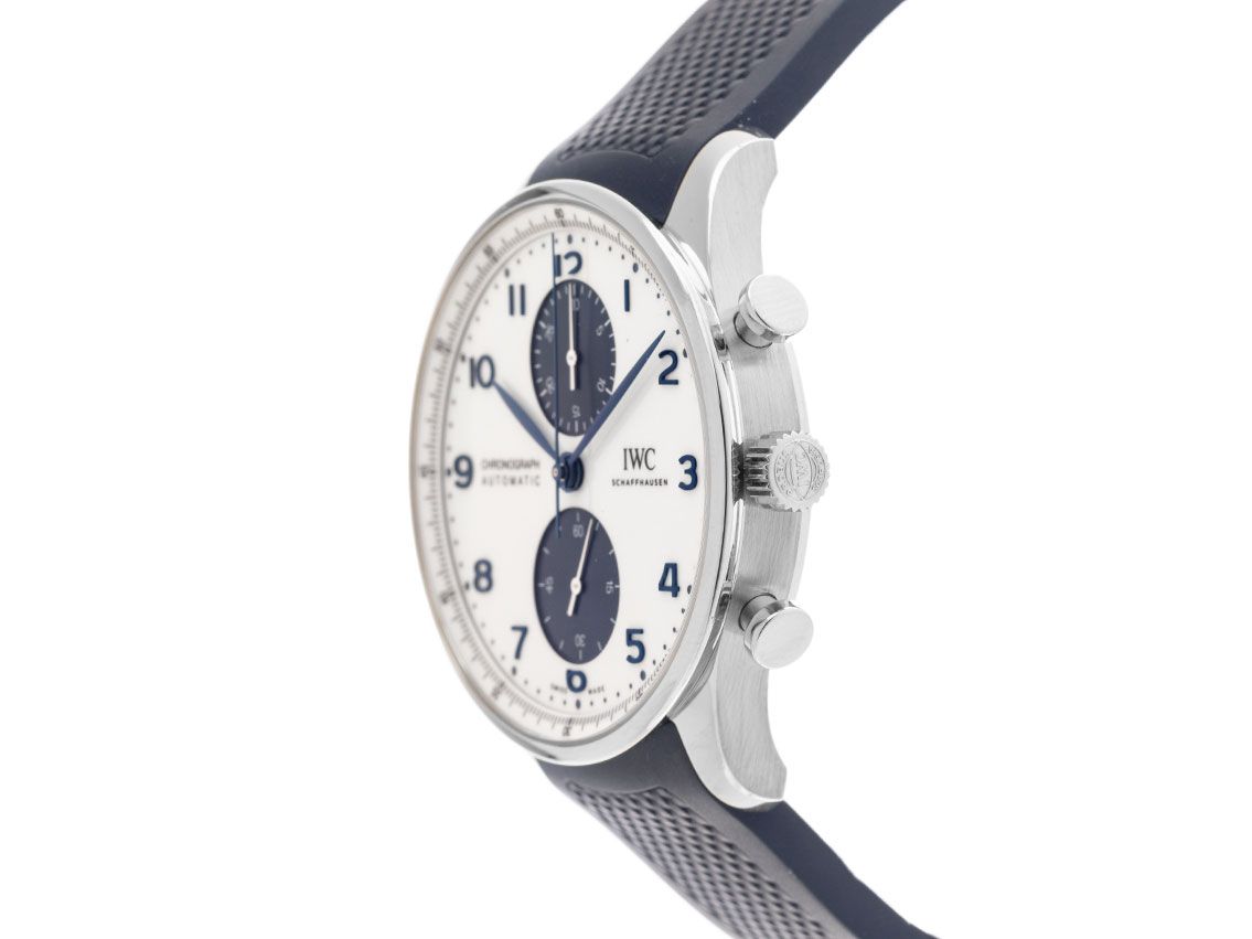 IWC Portugieser Stahl Automatik Chronograph Armband Kautschuk FaltschließeGehäuse Edelstahl poliert und satiniert, Gehäusedurchmesser ohne Krone 41mm, Gehäusehöhe 13,0mm. Lünette Edelstahl glatt und poliert. IWC Armband Kautschuk blau, Anstoßbreite 20mm, verdeckte Doppelsicherheitsfaltschließe Edelstahl mit Hersteller-Logo. Zifferblatt silberfarben mit aufgesetzten gebläuten arabischen Ziffern und gebläuten Zeigern. Uhrwerk Automatik, Chronograph, IWC Manufakturwerk 69355 mit 27 Edelsteinen, Gangreserve ca. 46 Stunden. Anzeige von Stunde und Minute über Zeiger aus der Mitte, kleine Sekunde mit Sekundenstopp zur sekundengenauen Einstellung der Uhrzeit bei 6 Uhr. Saphirglas kratzfest. Krone mit Hersteller-Logo. Boden Edelstahl 4-fach verschraubt und graviert mit Saphirglas Sichtfenster. Gewicht der Uhr inklusive Armband 108g. Wasserdicht bis 3 ATM. Referenznummer: IW371620, ID: ST1160130280326H-9100, Artikelnummer: 10000085055. Original IWC Box mit Umkarton und Garantie Papiere von Februar 2026 sowie Beschreibung und Poliertuch, Full Set. Ungetragen. Lieferzeit sofort.
