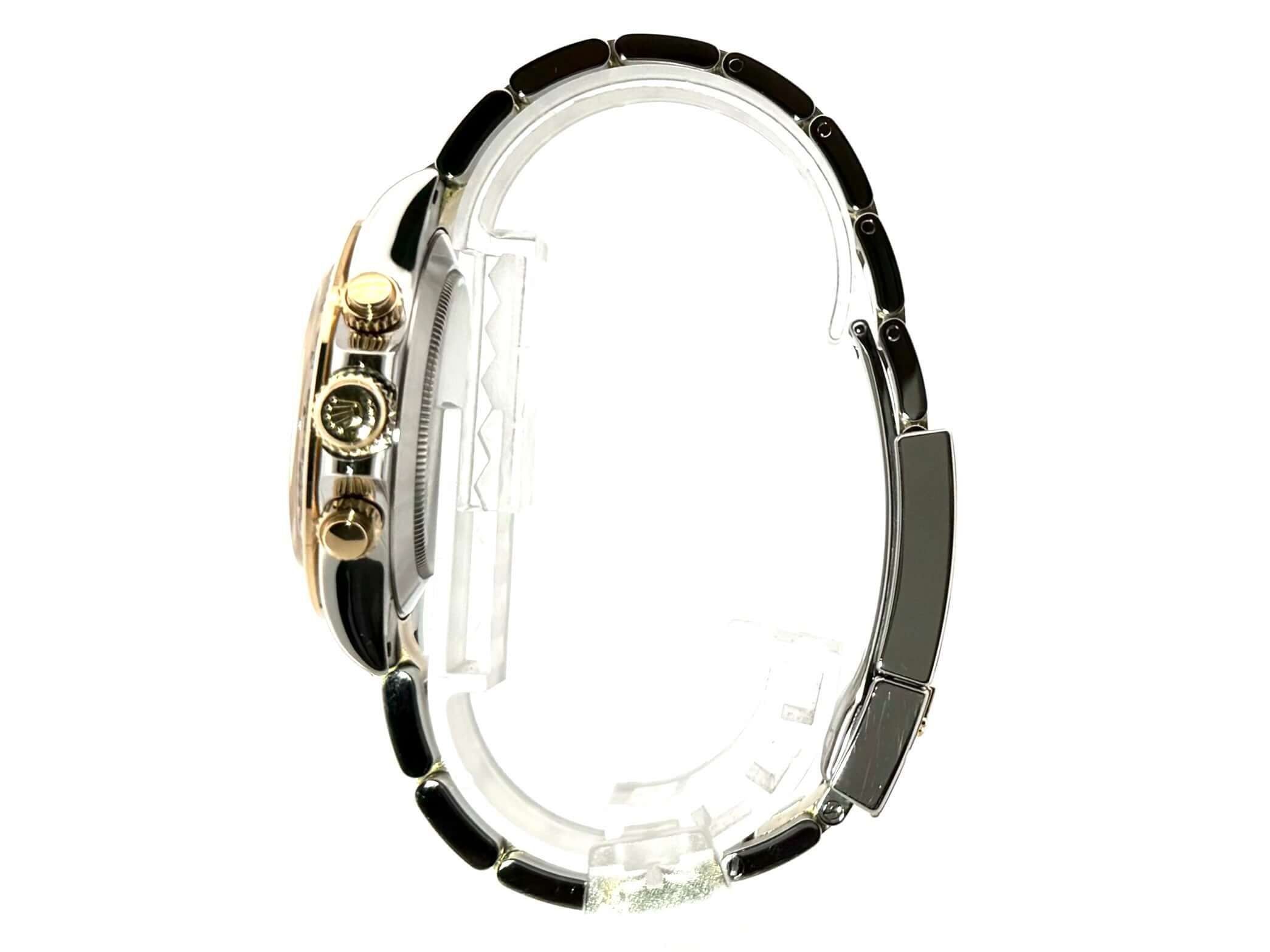 Boîtier en acier inoxydable de 40 mm, poli et satinée, lunette en or jaune 18 kt, polie avec échelle tachymétrique, bracelet en acier inoxydable Oyster / or jaune 18 kt, poli et satinée avec fermoir de sécurité pliant, cadran en diamant couleur champagne, automatique, calibre 4130 de manufacture Rolex, 44 rubis, réserve de marche d'environ 72 heures, chronomètre, verre saphir, couronne vissée avec protection latérale, fond de boîtier en acier inoxydable vissé, étanche jusqu'à 10 bars.