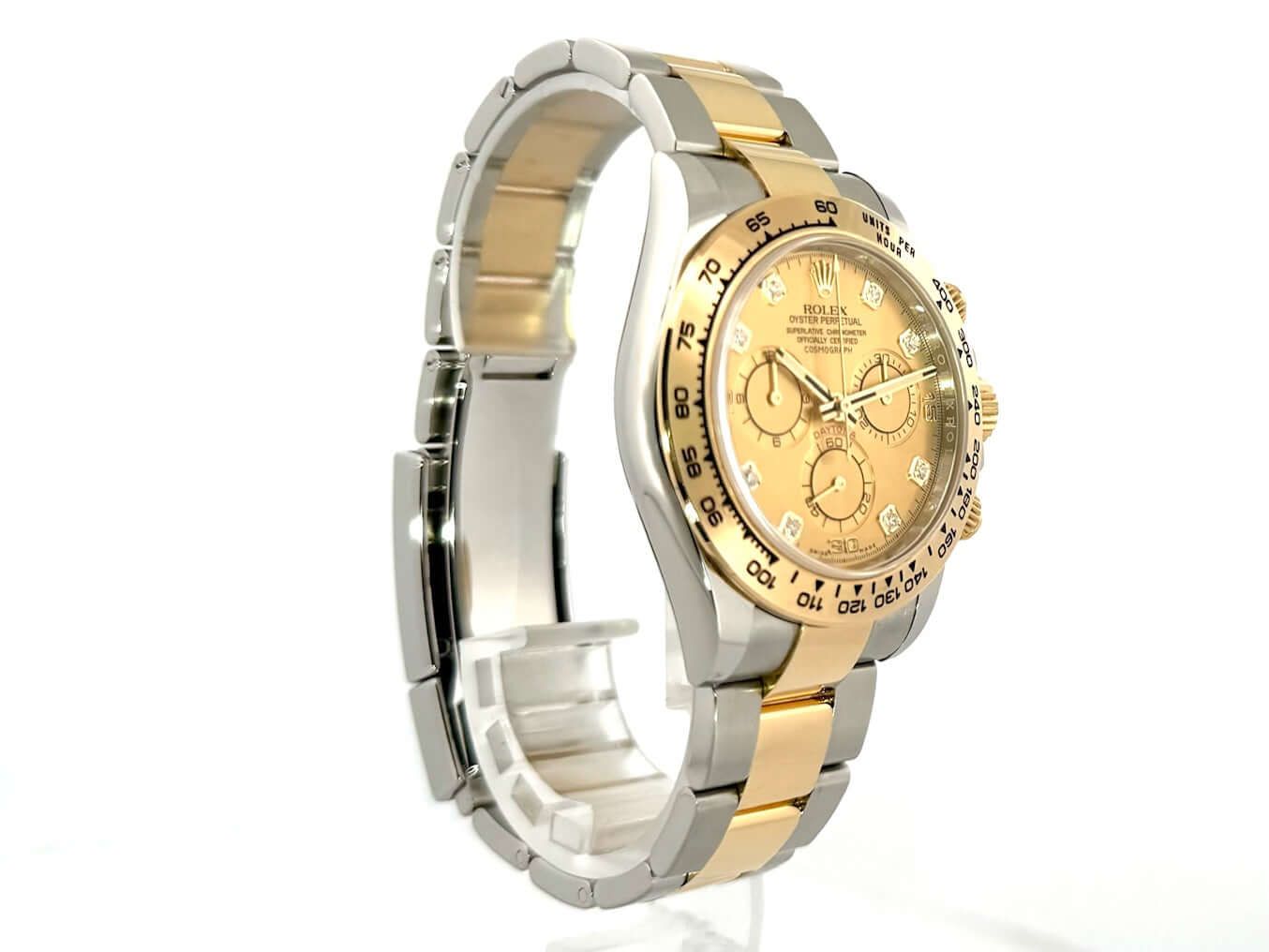 Rolex Cosmograph Daytona Stainless Steel / Yellow Gold Ref. 116503 Champagne DiamondCase made of 40 mm stainless steel, polished and satin-finished, 18 kt yellow gold bezel, polished with tachymeter scale, Oyster stainless steel / 18 kt yellow gold bracelet, polished and satin-finished with safety folding clasp, champagne-colored diamond dial, automatic, Rolex manufacture caliber 4130, 44 jewels, power reserve approx. 72 hours, chronometer, sapphire crystal, screw-down crown with flank protection, screw-down stainless steel case back, water resistant to 10 bar.